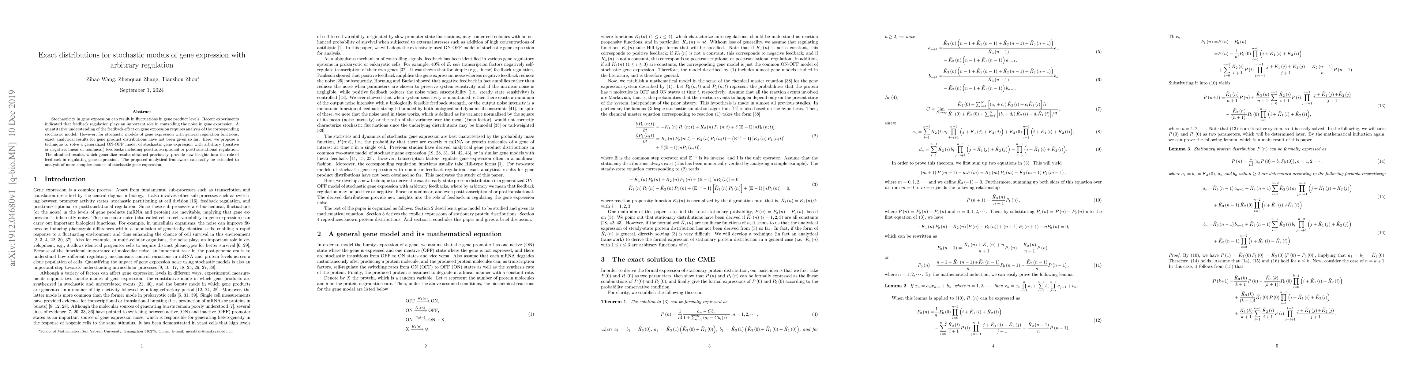 This paper proposes a technique to derive exact analytical distributions for stochastic gene expression models with arbitrary regulation, including both positive and negative feedbacks. The results provide new insights into the role of feedback mechanisms in controlling gene expression noise and can be extended to more complex models.