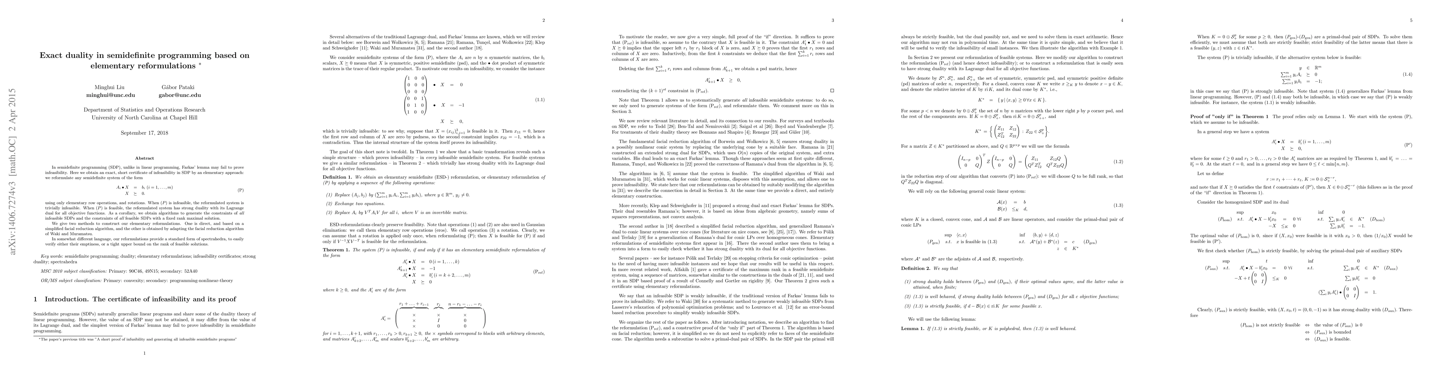 In semidefinite programming (SDP), unlike in linear programming, Farkas' lemma may fail to prove infeasibility. Here we obtain an exact, short certificate of infeasibility in SDP by an elementary approach: we reformulate any semidefinite system of the form Ai*X = bi (i=1,...,m) (P) X >= 0 using only elementary row operations, and rotations. When (P) is infeasible, the reformulated system is trivially infeasible. When (P) is feasible, the reformulated system has strong duality with its Lagrange dual for all objective functions. As a corollary, we obtain algorithms to generate the constraints of {\em all} infeasible SDPs and the constraints of {\em all} feasible SDPs with a fixed rank maximal solution.