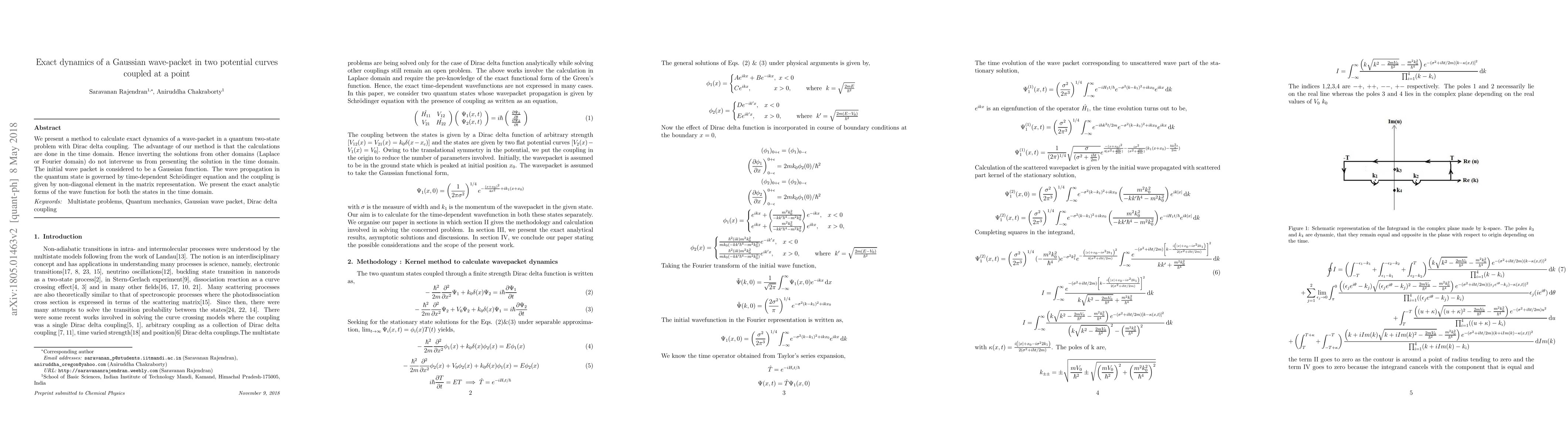 This paper proposes a method for calculating the exact dynamics of a Gaussian wave-packet in a quantum system with two potential curves coupled via a Dirac delta function. The method provides analytic solutions in the time domain without requiring transformations from other domains, offering a direct time-dependent description of the wave-packet evolution.