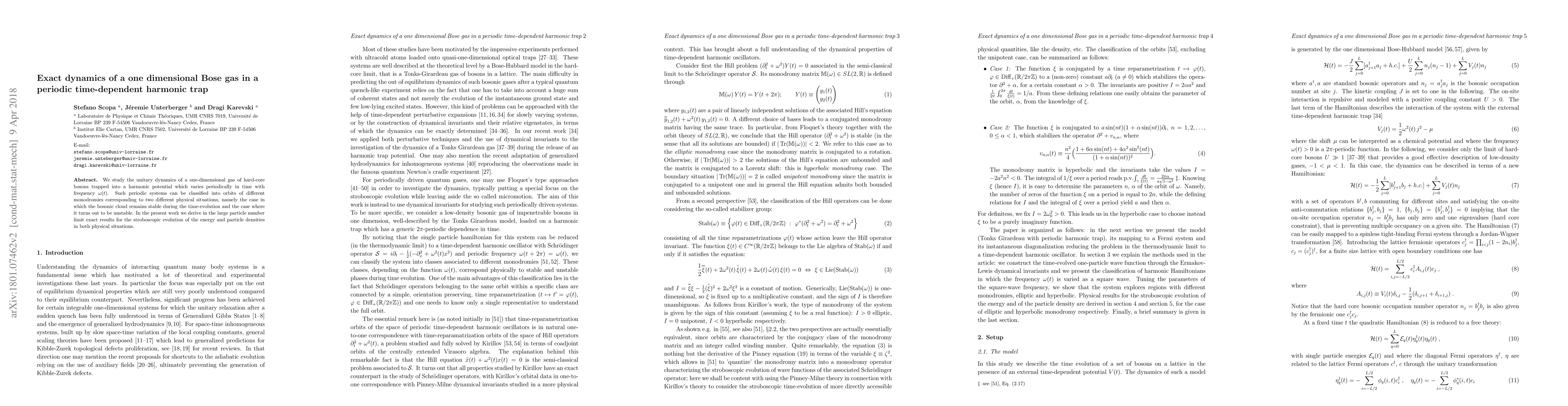 Researchers studied a one-dimensional gas of bosons trapped in a periodic time-dependent harmonic trap, finding exact results for its energy and particle densities in two physical situations.
