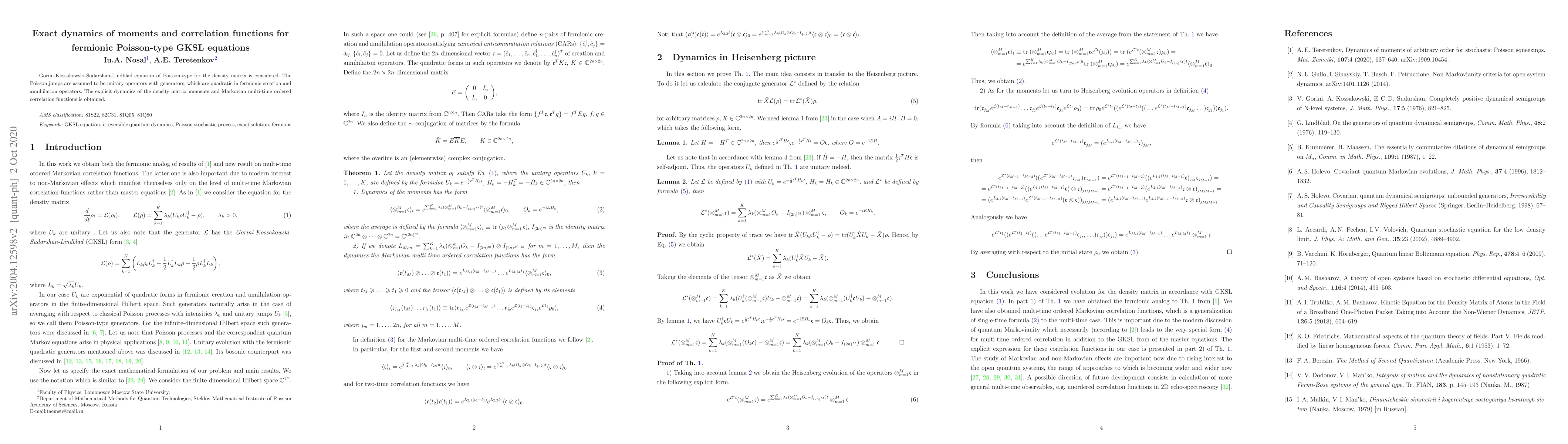 Gorini-Kossakowski-Sudarshan-Lindblad equation of Poisson-type for the density matrix is considered. The Poisson jumps are assumed to be unitary operators with generators, which are quadratic in fermionic creation and annihilation operators. The explicit dynamics of the density matrix moments and Markovian multi-time ordered correlation functions is obtained.