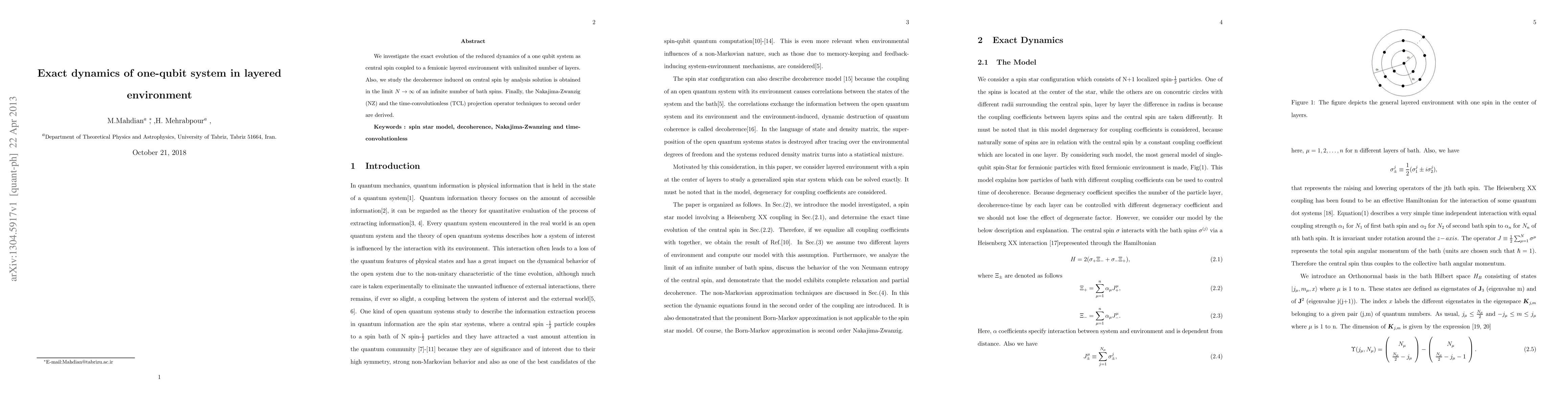 We investigate the exact evolution of the reduced dynamics of a one qubit system as central spin coupled to a femionic layered environment with unlimited number of layers. Also, we study the decoherence induced on central spin by analysis solution is obtained in the limit $N\rightarrow\infty$ of an infinite number of bath spins. Finally, the Nakajima-Zwanzig (NZ) and the time-convolutionless (TCL) projection operator techniques to second order are derived.