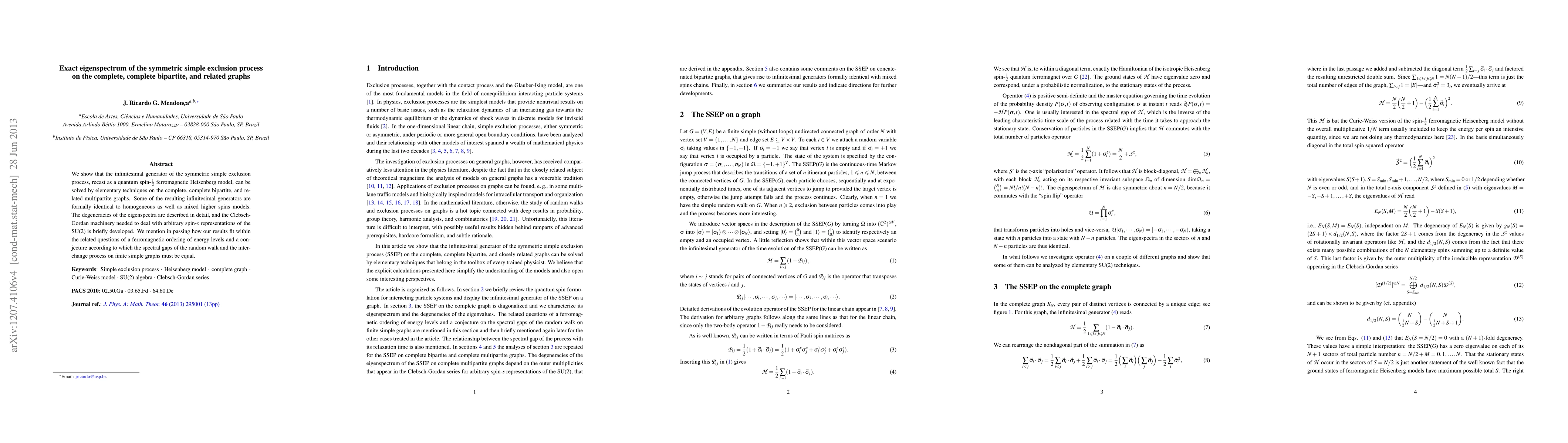 This paper solves the symmetric simple exclusion process on complete, complete bipartite, and related graphs by recasting it as a quantum spin-1/2 model, revealing exact eigenspectra and degeneracies. It also discusses the connection to higher spin models and the conjecture regarding spectral gaps in random walks.