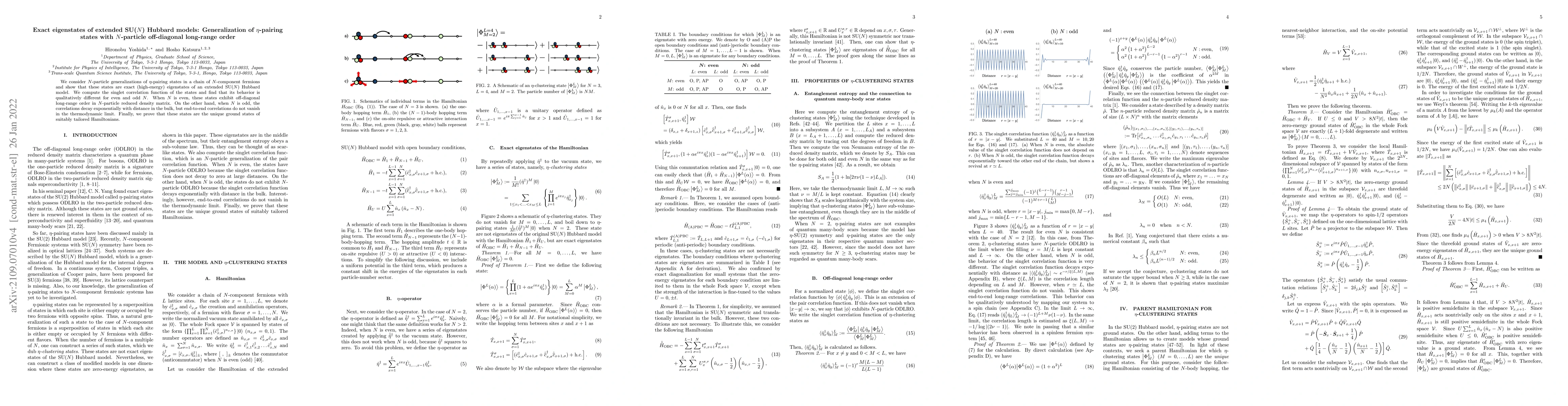 We consider $N$-particle generalizations of $\eta$-pairing states in a chain of $N$-component fermions and show that these states are exact (high-energy) eigenstates of an extended SU($N$) Hubbard model. We compute the singlet correlation function of the states and find that its behavior is qualitatively different for even and odd $N$. When $N$ is even, these states exhibit off-diagonal long-range order in $N$-particle reduced density matrix. On the other hand, when $N$ is odd, the correlations decay exponentially with distance in the bulk, but end-to-end correlations do not vanish in the thermodynamic limit. Finally, we prove that these states are the unique ground states of suitably tailored Hamiltonians.