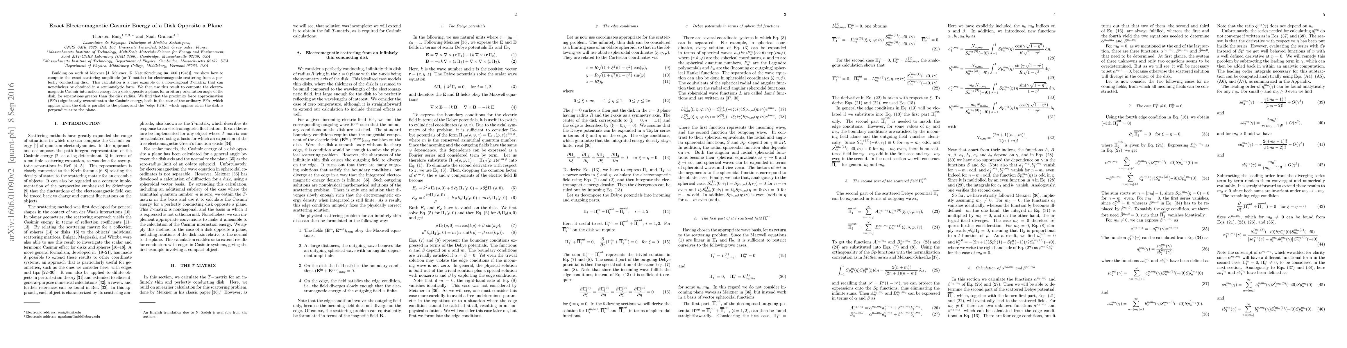 Building on work of Meixner [J. Meixner, Z. Naturforschung 3a, 506 (1948)], we show how to compute the exact scattering amplitude (or $T$-matrix) for electromagnetic scattering from a perfectly conducting disk. This calculation is a rare example of a non-diagonal $T$-matrix that can nonetheless be obtained in a semi-analytic form. We then use this result to compute the electromagnetic Casimir interaction energy for a disk opposite a plane, for arbitrary orientation angle of the disk, for separations greater than the disk radius. We find that the proximity force approximation (PFA) significantly overestimates the Casimir energy, both in the case of the ordinary PFA, which applies when the disk is parallel to the plane, and the "edge PFA," which applies when the disk is perpendicular to the plane.