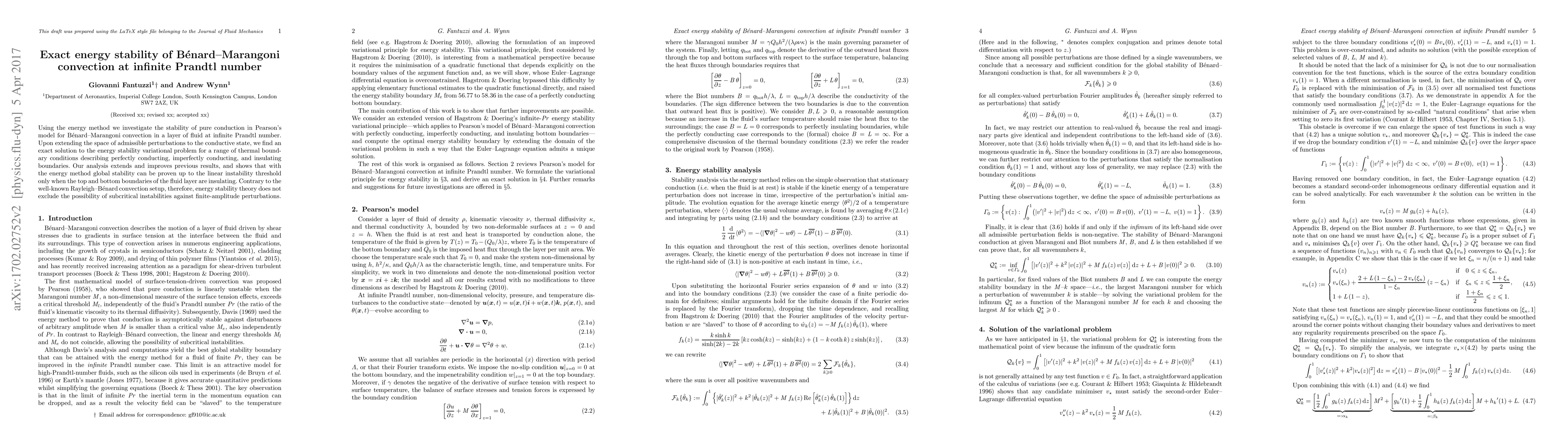 Using the energy method we investigate the stability of pure conduction in Pearson's model for B\'enard-Marangoni convection in a layer of fluid at infinite Prandtl number. Upon extending the space of admissible perturbations to the conductive state, we find an exact solution to the energy stability variational problem for a range of thermal boundary conditions describing perfectly conducting, imperfectly conducting, and insulating boundaries. Our analysis extends and improves previous results, and shows that with the energy method global stability can be proven up to the linear instability threshold only when the top and bottom boundaries of the fluid layer are insulating. Contrary to the well-known Rayleigh-B\'enard convection setup, therefore, energy stability theory does not exclude the possibility of subcritical instabilities against finite-amplitude perturbations.