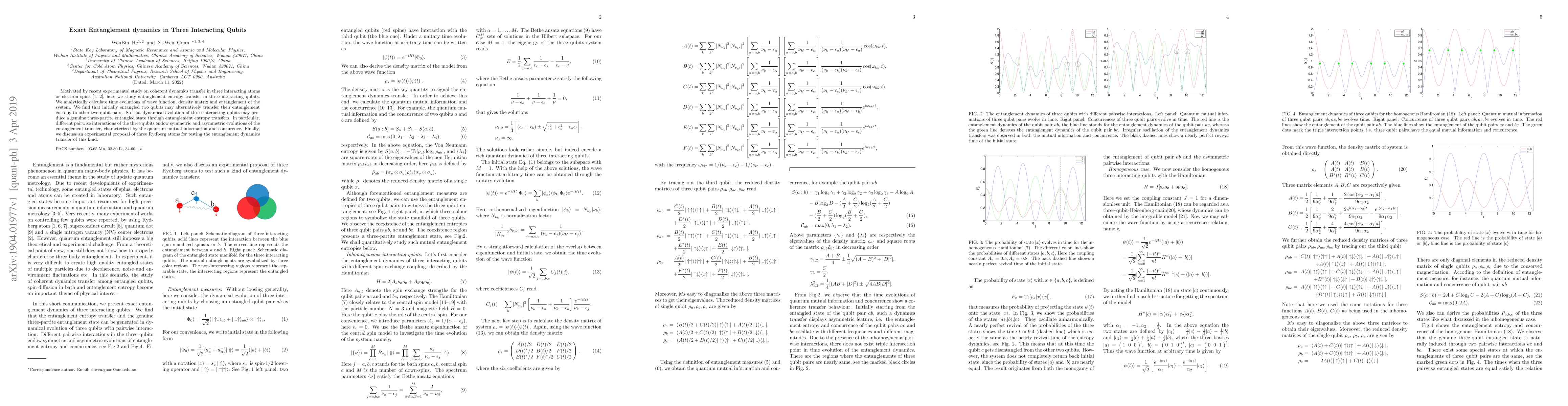 This paper analytically investigates the entanglement dynamics in a system of three interacting qubits, finding that initial entanglement can transfer between qubit pairs, potentially leading to a genuine three-partite entangled state. The study highlights the role of different pairwise interactions in shaping symmetric and asymmetric entanglement transfer, and proposes an experimental setup using three Rydberg atoms to verify these dynamics.