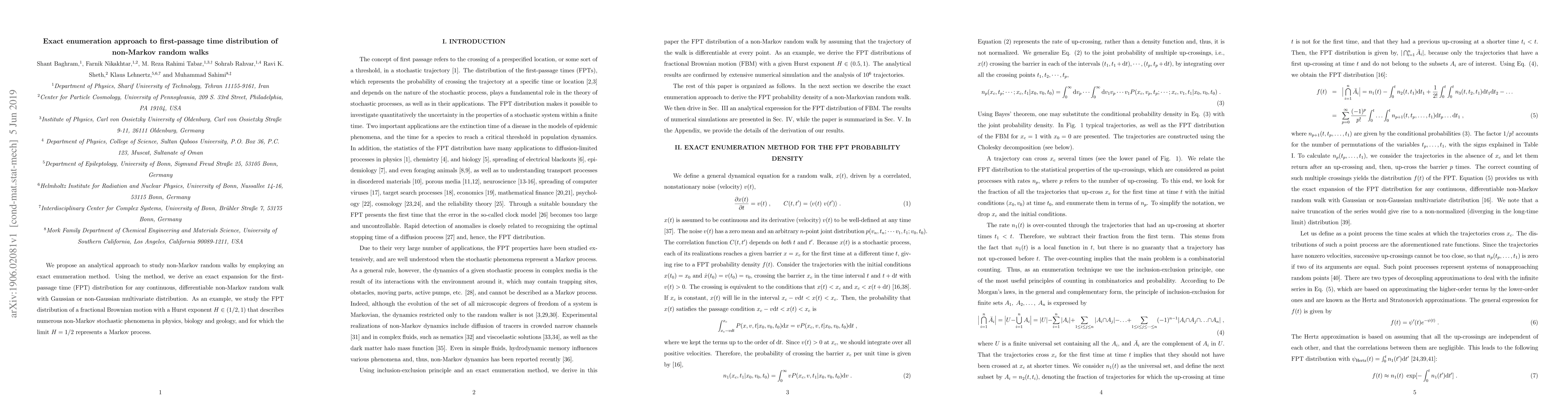 We propose an analytical approach to study non-Markov random walks by employing an exact enumeration method. Using the method, we derive an exact expansion for the first-passage time (FPT) distribution for any continuous, differentiable non-Markov random walk with Gaussian or non-Gaussian multivariate distribution. As an example, we study the FPT distribution of a fractional Brownian motion with a Hurst exponent $H\in(1/2,1)$ that describes numerous non-Markov stochastic phenomena in physics, biology and geology, and for which the limit $H=1/2$ represents a Markov process.