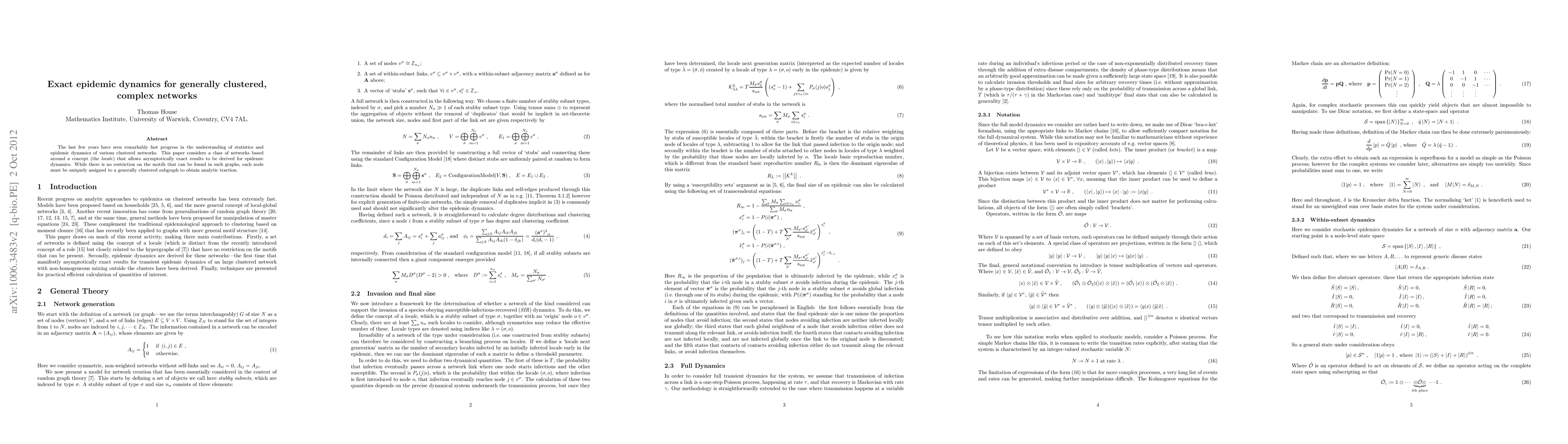 This paper develops an exact analytical framework for modeling epidemic dynamics in generally clustered, complex networks, deriving asymptotically precise results for infection spread while allowing diverse network motifs. The approach uniquely assigns each node to a subgraph to achieve analytical tractability.