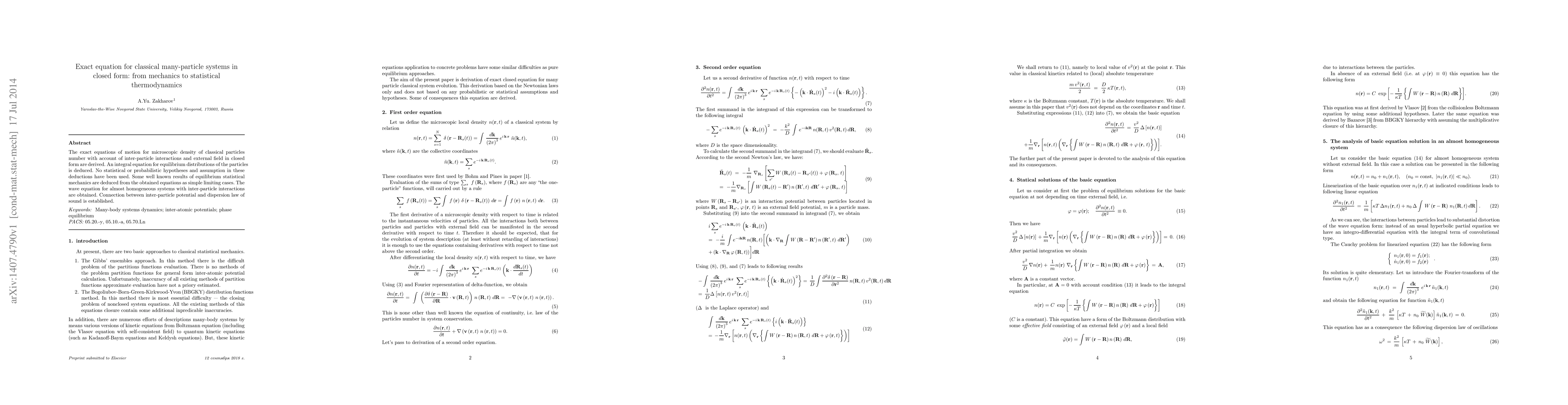 Researchers derived exact equations of motion for classical many-particle systems with inter-particle interactions, leading to new insights into phase equilibrium, sound dispersion, and statistical mechanics without relying on probabilistic assumptions.