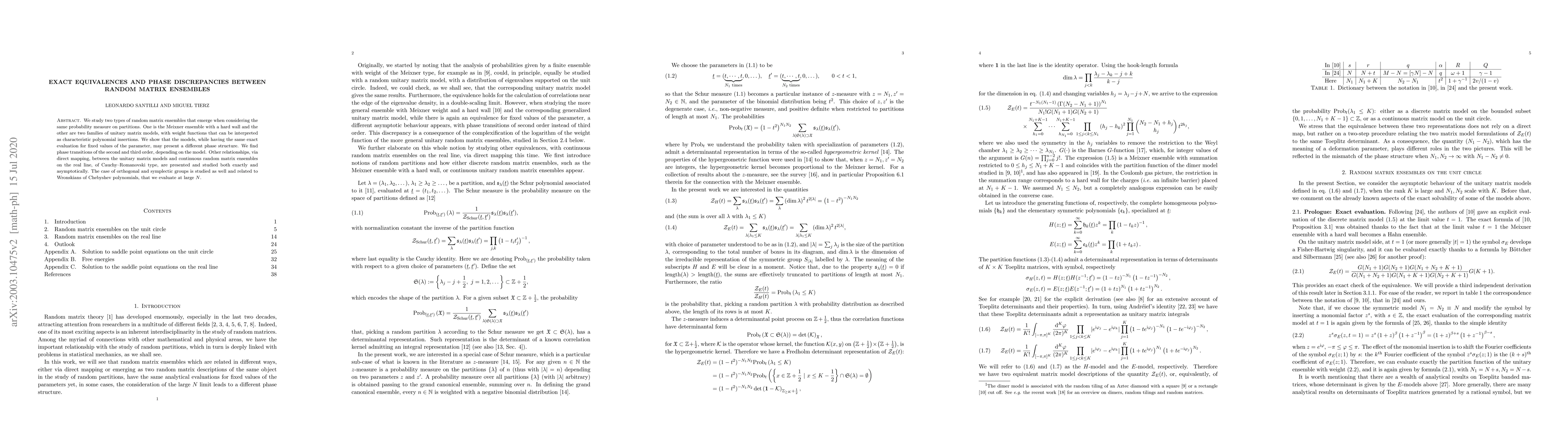 We study two types of random matrix ensembles that emerge when considering the same probability measure on partitions. One is the Meixner ensemble with a hard wall and the other are two families of unitary matrix models, with weight functions that can be interpreted as characteristic polynomial insertions. We show that the models, while having the same exact evaluation for fixed values of the parameter, may present a different phase structure. We find phase transitions of the second and third order, depending on the model. Other relationships, via direct mapping, between the unitary matrix models and continuous random matrix ensembles on the real line, of Cauchy-Romanovski type, are presented and studied both exactly and asymptotically. The case of orthogonal and symplectic groups is studied as well and related to Wronskians of Chebyshev polynomials, that we evaluate at large $N$.