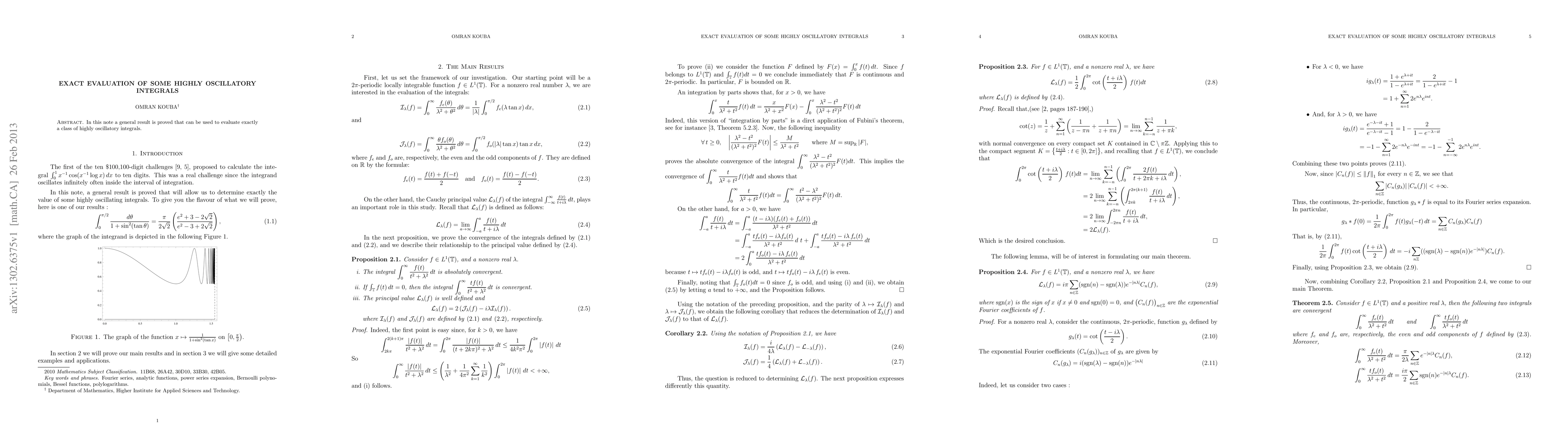 Summary: The paper presents a general result for the exact evaluation of a class of highly oscillatory integrals, providing a method applicable to these complex mathematical expressions. This result can simplify the analysis of such integrals in various scientific fields.