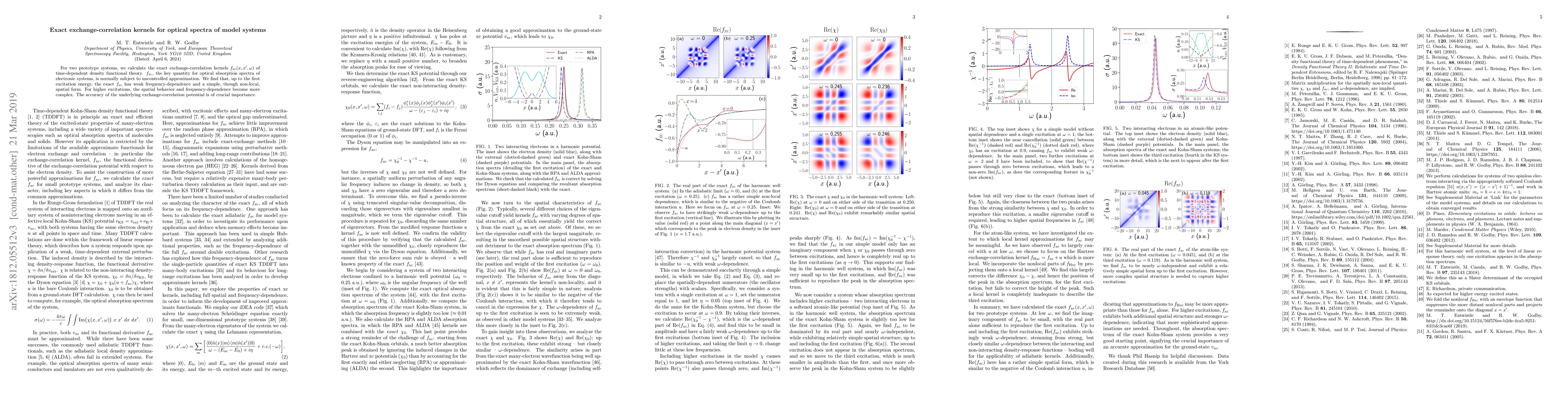 This paper calculates exact exchange-correlation kernels for optical spectra in two prototype systems, revealing that the kernels exhibit weak frequency-dependence and a simple spatial form up to the first excitation energy. For higher excitations, the spatial behavior and frequency-dependence become more complex, highlighting the importance of accurate exchange-correlation potentials.