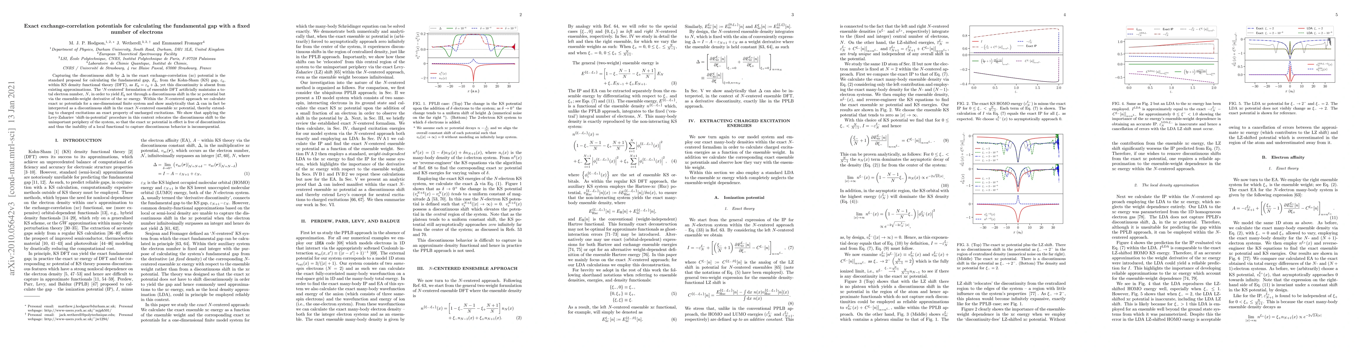 Capturing the discontinuous shift by $\Delta$ in the exact exchange-correlation (xc) potential is the standard proposal for calculating the fundamental gap, $E_\mathrm{g}$, from the Kohn-Sham (KS) gap, $\varepsilon_\mathrm{g}$, within KS density functional theory (DFT), as $E_\mathrm{g} = \varepsilon_\mathrm{g} + \Delta$, yet this discontinuity is absent from existing approximations. The '$N$-centered' formulation of ensemble DFT artificially maintains a total electron number, $N$, in order to yield $E_\mathrm{g}$ not through a discontinuous shift in the xc potential but via the ensemble-weight derivative of the xc energy. Within the $N$-centered approach we calculate exact xc potentials for a one-dimensional finite system and show analytically that $\Delta$ can in fact be interpreted as a discontinuous shift in the exact $N$-centered ensemble xc potential, thereby extending to charged excitations an exact property of uncharged excitations. We show that applying the Levy-Zahariev 'shift-in-potential' procedure in this context relocates the discontinuous shift to the unimportant periphery of the system, so that the exact xc potential in effect is free of discontinuities and thus the inability of a local functional to capture discontinuous behavior is inconsequential.