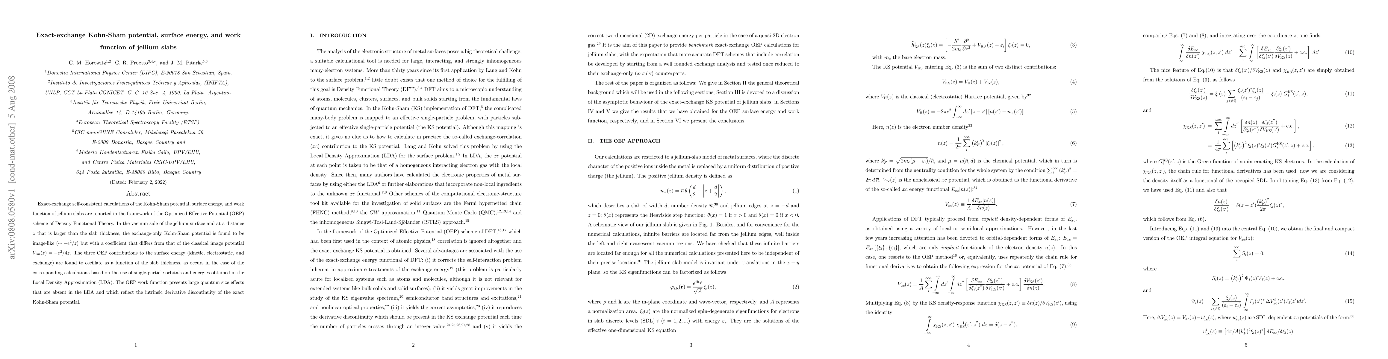 This paper reports exact-exchange calculations of the Kohn-Sham potential, surface energy, and work function of jellium slabs using the Optimized Effective Potential scheme within Density Functional Theory. The exchange-only potential exhibits image-like behavior but with a different coefficient than the classical image potential. The surface energy contributions oscillate with slab thickness, and the OEP work function shows significant quantum size effects not seen in Local Density Approximation calculations.