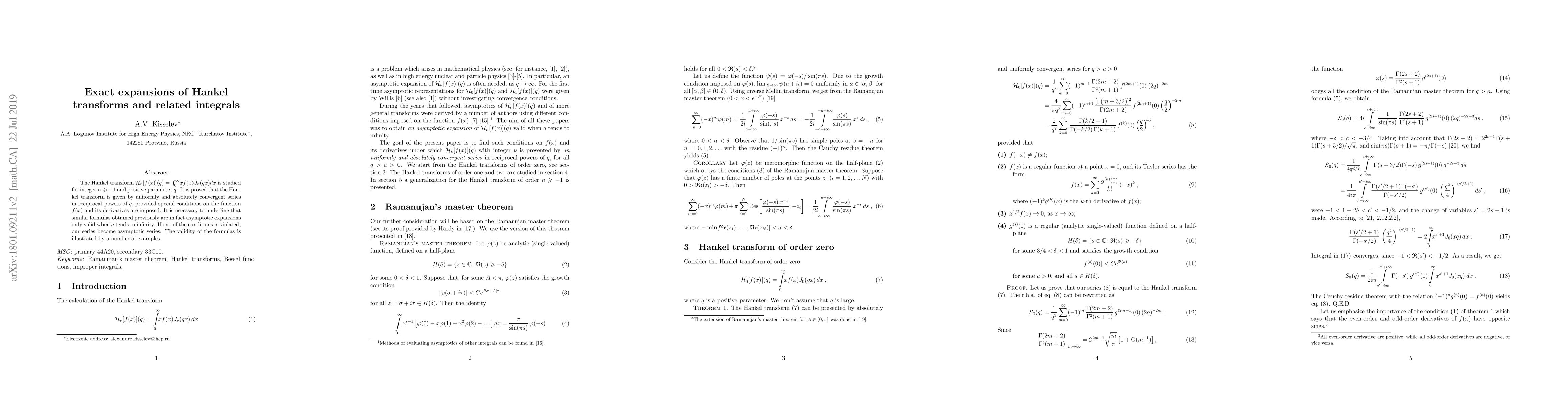 The paper presents exact expansions of Hankel transforms and related integrals, contrasting with previous asymptotic expansions valid only for large q.