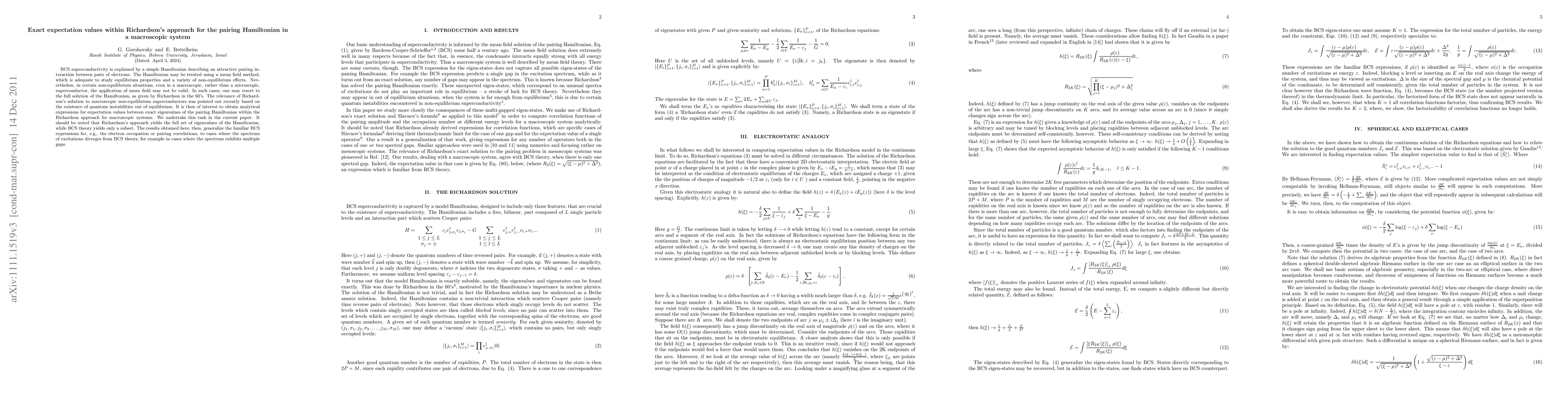This paper develops analytical expressions for exact expectation values within Richardson's approach for the pairing Hamiltonian in macroscopic systems, providing a full solution that generalizes BCS theory, especially relevant for nonequilibrium superconductors with quantum instabilities.