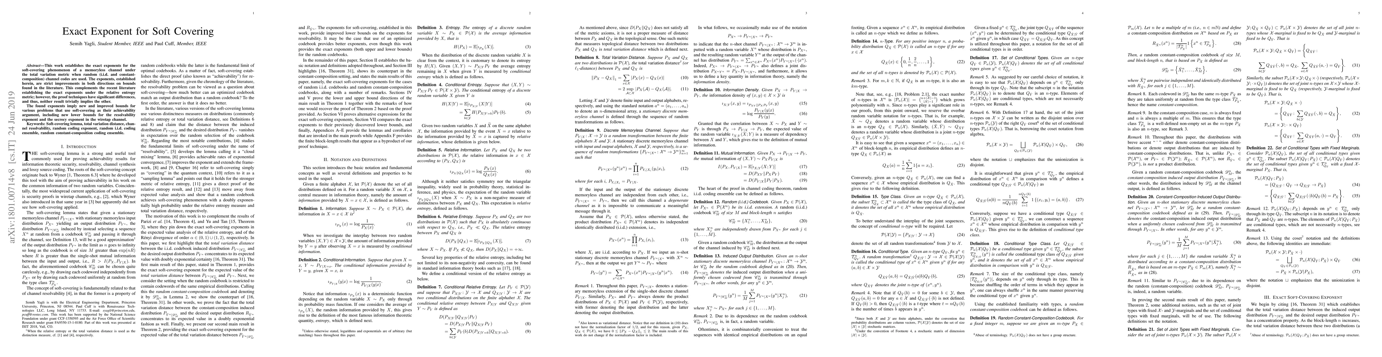This work establishes the exact exponents for the soft-covering phenomenon of a memoryless channel under the total variation metric when random (i.i.d. and constant-composition) channel codes are used. The exponents, established herein, are strict improvements in both directions on bounds found in the literature. This complements the recent literature establishing the exact exponents under the relative entropy metric; however, the proof techniques have significant differences, and thus, neither result trivially implies the other. The found exponents imply new and improved bounds for various problems that use soft-covering as their achievability argument, including new lower bounds for the resolvability exponent and the secrecy exponent in the wiretap channel.