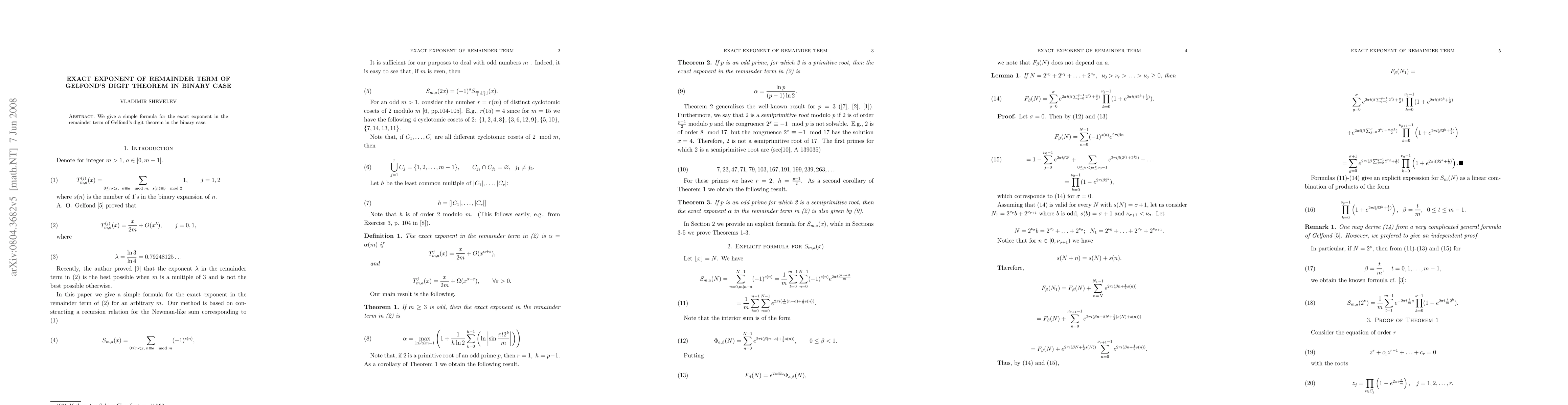 We give a simple formula for the exact exponent in the remainder term of the main Gelfond's digit theorem in the binary case.