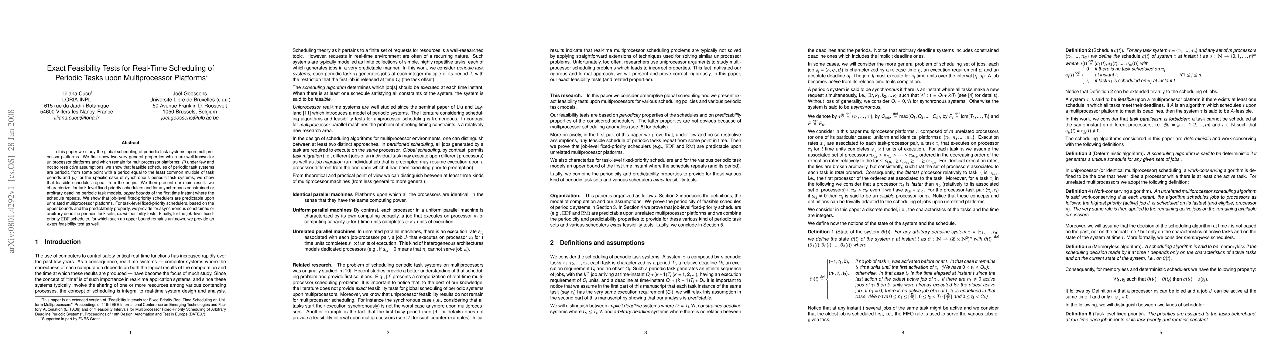 This paper explores the feasibility of scheduling periodic tasks on multiprocessor platforms, demonstrating that feasible schedules are periodic and repeatable under certain conditions. It provides exact feasibility tests for task-level fixed-priority schedulers and introduces a test for the job-level fixed-priority EDF scheduler.
