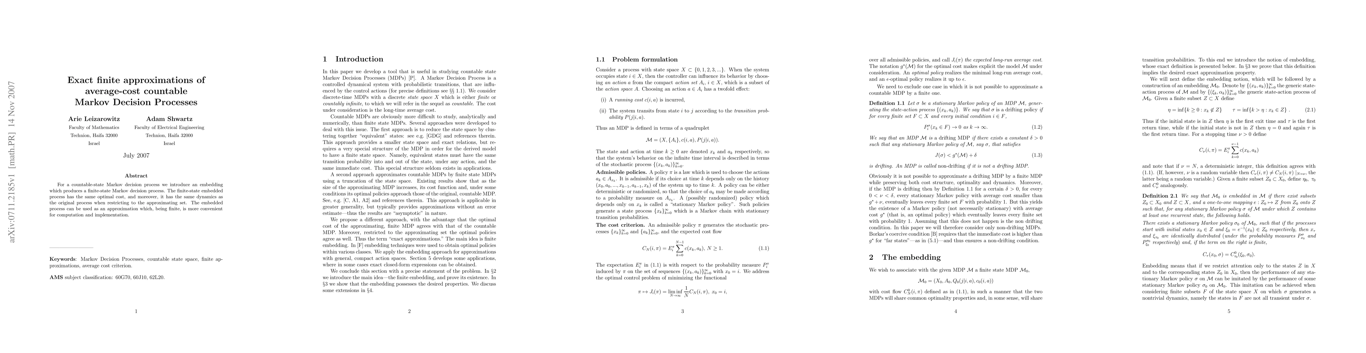 For a countable-state Markov decision process we introduce an embedding which produces a finite-state Markov decision process. The finite-state embedded process has the same optimal cost, and moreover, it has the same dynamics as the original process when restricting to the approximating set. The embedded process can be used as an approximation which, being finite, is more convenient for computation and implementation.