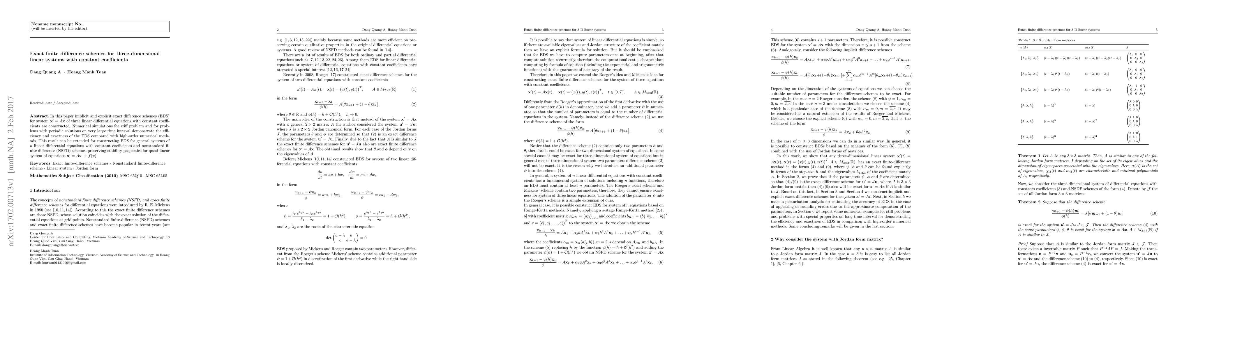 In this paper implicit and explicit exact difference schemes (EDS) for system $\textbf{x}' = A\textbf{x}$ of three linear differential equations with constant coefficients are constructed. Numerical simulations for stiff problem and for problems with periodic solutions on very large time interval demonstrate the efficiency and exactness of the EDS compared with high-order numerical methods. This result can be extended for constructing EDS for general systems of $n$ linear differential equations with constant coefficients and nonstandard finite difference (NSFD) schemes preserving stability properties for quasi-linear system of equations $\textbf{x}' = A\textbf{x }+ f(\textbf{x})$.