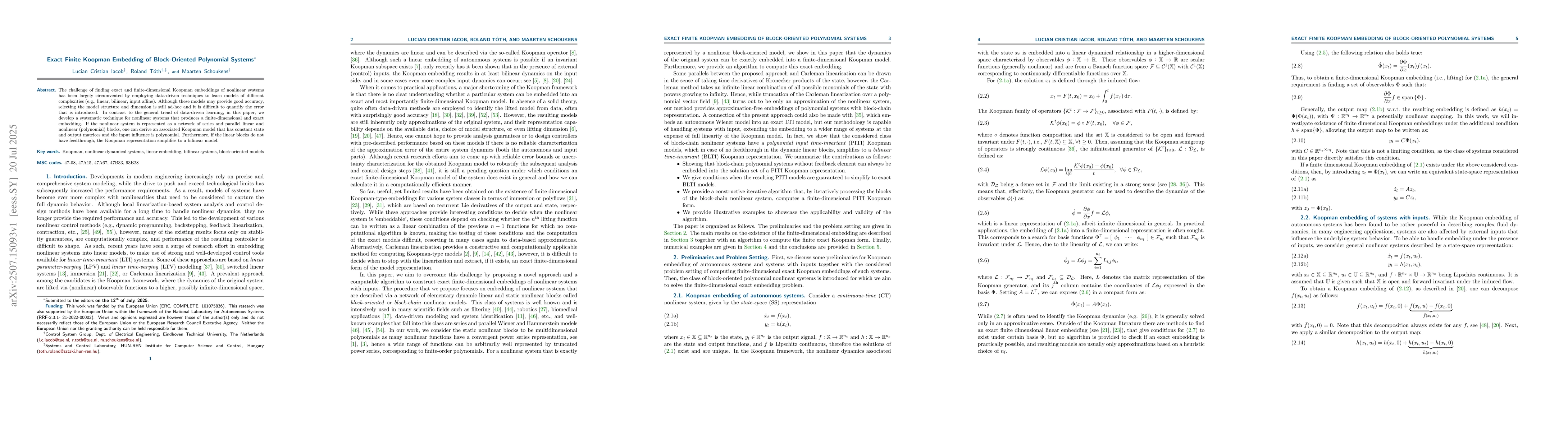 The challenge of finding exact and finite-dimensional Koopman embeddings of nonlinear systems has been largely circumvented by employing data-driven techniques to learn models of different complexities (e.g., linear, bilinear, input affine). Although these models may provide good accuracy, selecting the model structure and dimension is still ad-hoc and it is difficult to quantify the error that is introduced. In contrast to the general trend of data-driven learning, in this paper, we develop a systematic technique for nonlinear systems that produces a finite-dimensional and exact embedding. If the nonlinear system is represented as a network of series and parallel linear and nonlinear (polynomial) blocks, one can derive an associated Koopman model that has constant state and output matrices and the input influence is polynomial. Furthermore, if the linear blocks do not have feedthrough, the Koopman representation simplifies to a bilinear model.