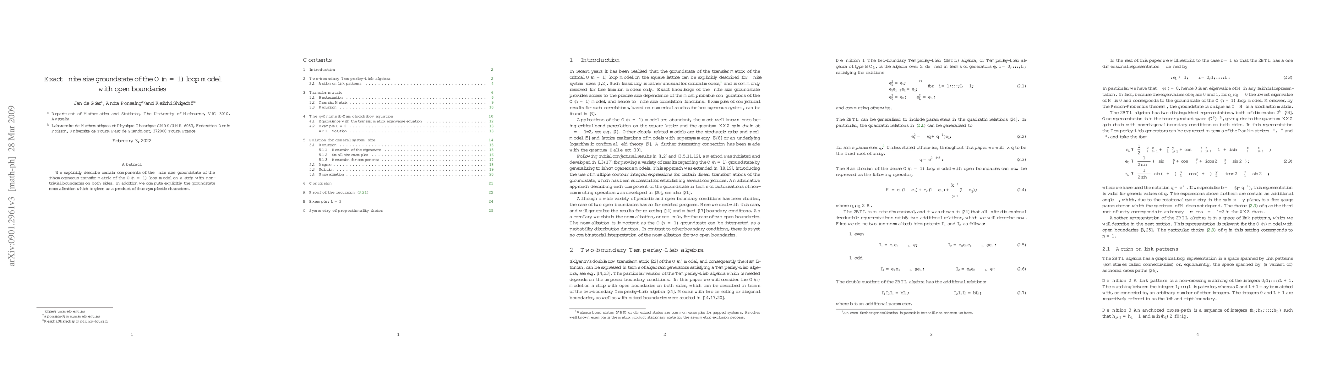 The paper details the finite size groundstate of the O(n=1) loop model with open boundaries, explicitly describing key components and computing the groundstate normalization as a product of four symplectic characters.