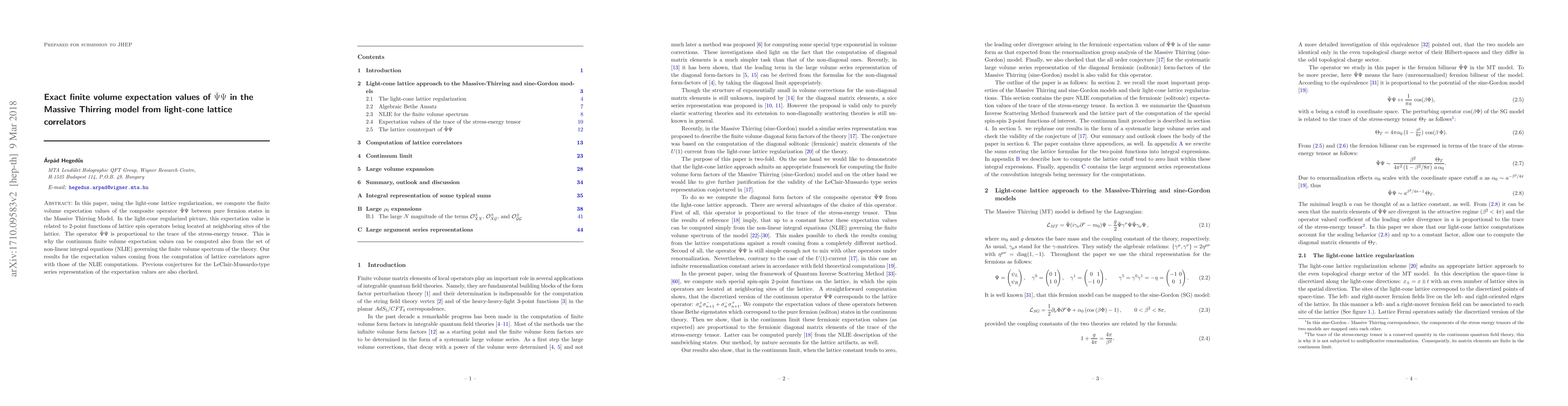 In this paper, using the light-cone lattice regularization, we compute the finite volume expectation values of the composite operator $\bar{\Psi}\Psi$ between pure fermion states in the Massive Thirring Model. In the light-cone regularized picture, this expectation value is related to 2-point functions of lattice spin operators being located at neighboring sites of the lattice. The operator $\bar{\Psi}\Psi$ is proportional to the trace of the stress-energy tensor. This is why the continuum finite volume expectation values can be computed also from the set of non-linear integral equations (NLIE) governing the finite volume spectrum of the theory. Our results for the expectation values coming from the computation of lattice correlators agree with those of the NLIE computations. Previous conjectures for the LeClair-Mussardo-type series representation of the expectation values are also checked.
