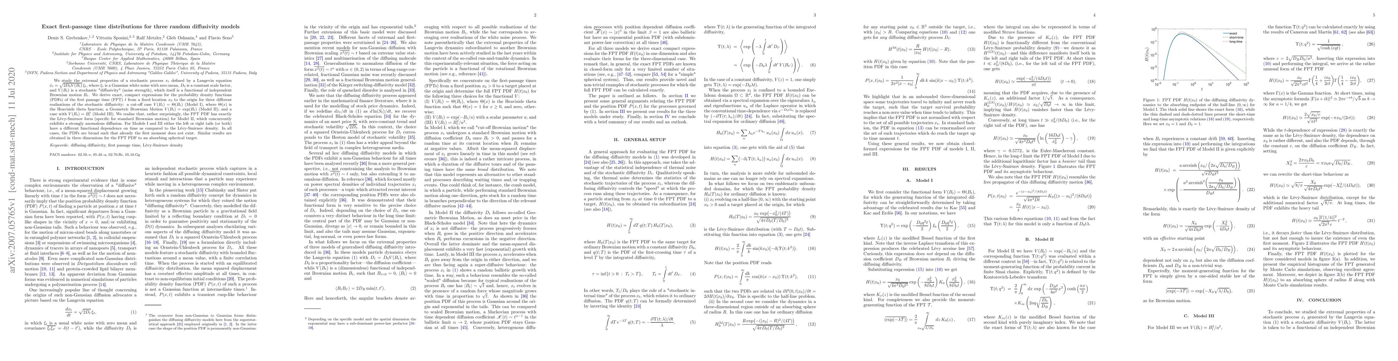 This paper derives exact expressions for first passage time probability density functions for three stochastic diffusivity models. Notably, Model II exhibits anomalous diffusion yet retains the L\'evy-Smirnov form, while Models I and III show differing tail behaviors compared to standard Brownian motion.