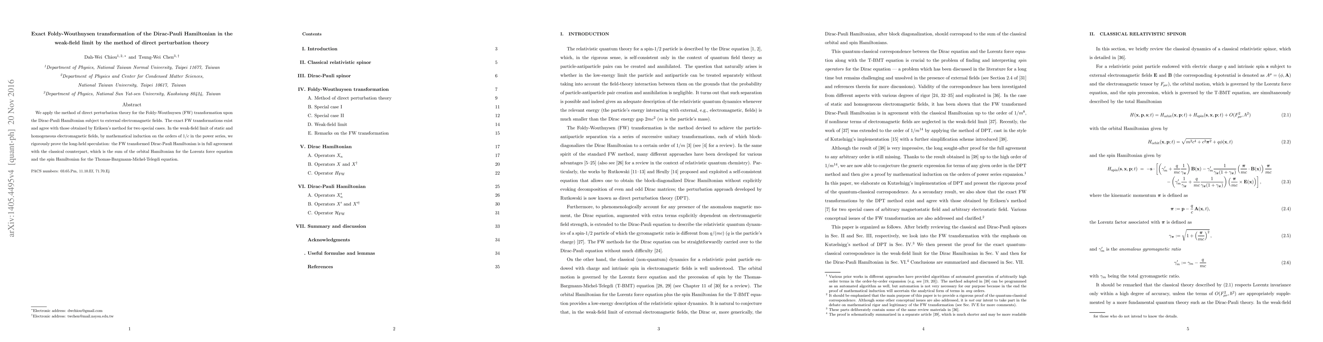 We apply the method of direct perturbation theory for the Foldy-Wouthuysen (FW) transformation upon the Dirac-Pauli Hamiltonian subject to external electromagnetic fields. The exact FW transformations exist and agree with those obtained by Eriksen's method for two special cases. In the weak-field limit of static and homogeneous electromagnetic fields, by mathematical induction on the orders of $1/c$ in the power series, we rigorously prove the long-held speculation: the FW transformed Dirac-Pauli Hamiltonian is in full agreement with the classical counterpart, which is the sum of the orbital Hamiltonian for the Lorentz force equation and the spin Hamiltonian for the Thomas-Bargmann-Michel-Telegdi equation.