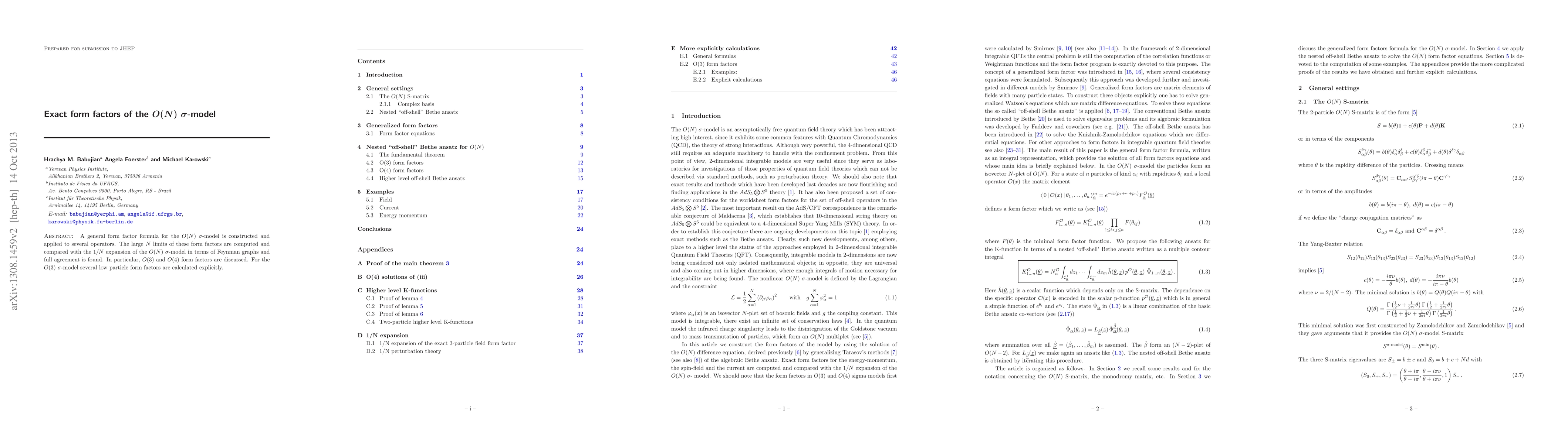 This paper constructs a general formula for form factors in the O(N) σ-model and applies it to various operators, finding full agreement between the large N limits and the 1/N expansion via Feynman graphs. Specific calculations for O(3) and O(4) models, including explicit low particle form factors for the O(3) σ-model, are also discussed.