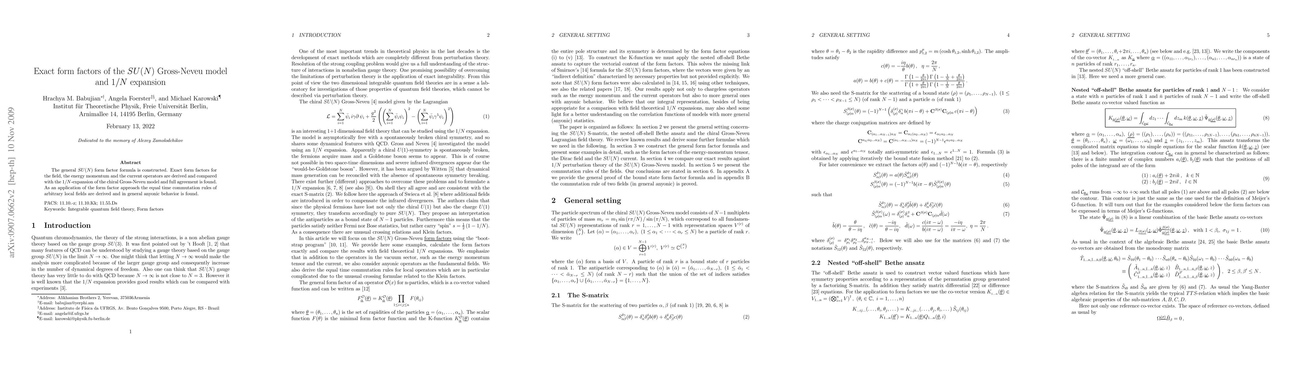 This paper constructs the general SU(N) form factor formula and derives exact form factors for field, energy-momentum, and current operators. It finds full agreement between these exact results and the 1/N expansion of the chiral Gross-Neveu model, and uses the form factor approach to derive commutation rules revealing anyonic behavior for arbitrary local fields.