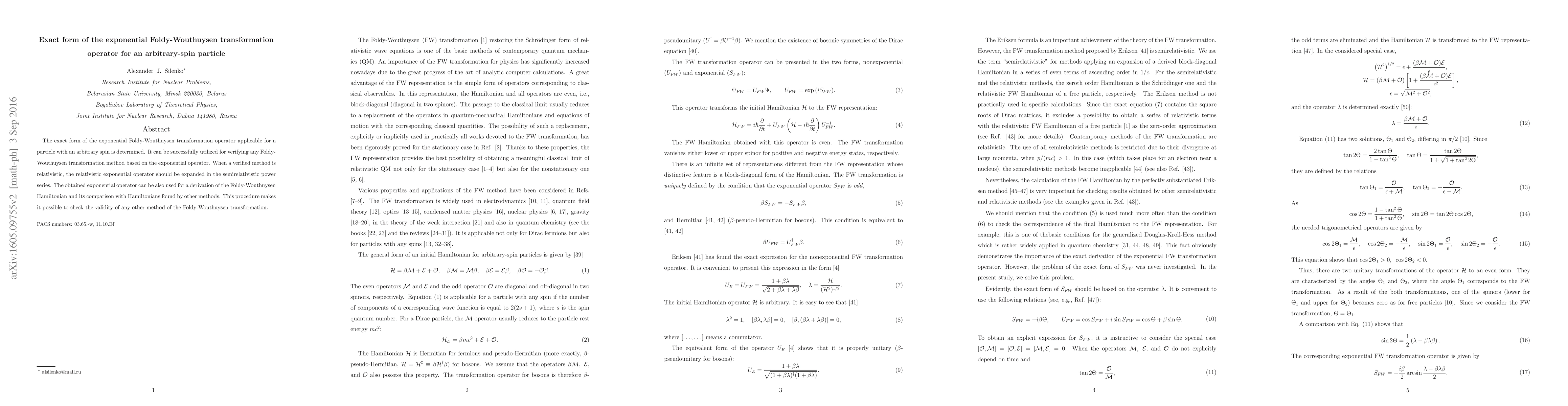 The paper derives an exact exponential Foldy-Wouthuysen transformation operator for particles with arbitrary spin, providing a benchmark for verifying other transformation methods. It also discusses expanding the relativistic operator in a semirelativistic power series for practical applications.