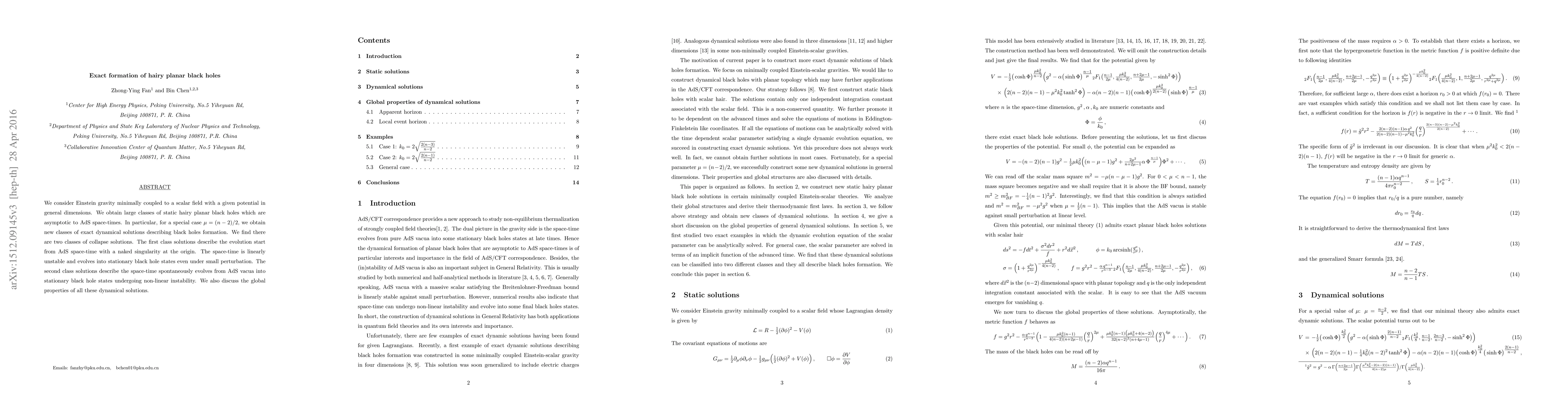 We consider Einstein gravity minimally coupled to a scalar field with a given potential in general dimensions. We obtain large classes of static hairy planar black holes which are asymptotic to AdS space-times. In particular, for a special case $\mu=(n-2)/2$, we obtain new classes of exact dynamical solutions describing black holes formation. We find there are two classes of collapse solutions. The first class solutions describe the evolution start from AdS space-time with a naked singularity at the origin. The space-time is linearly unstable and evolves into stationary black hole states even under small perturbation. The second class solutions describe the space-time spontaneously evolves from AdS vacua into stationary black hole states undergoing non-linear instability. We also discuss the global properties of all these dynamical solutions.