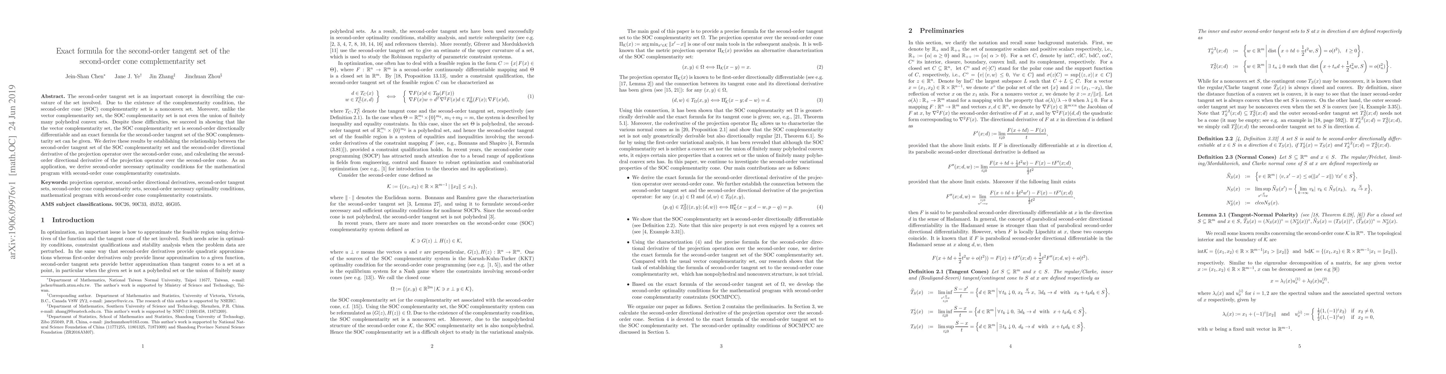 This paper presents an exact formula for the second-order tangent set of the second-order cone complementarity set, demonstrating its second-order directionally differentiability and deriving second-order necessary optimality conditions for mathematical programs with such constraints. The research connects the tangent set with the second-order directional derivative of the projection operator over the second-order cone.