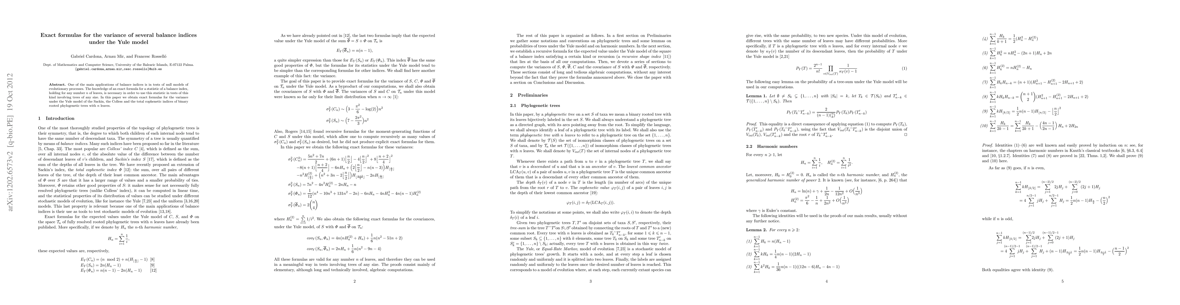 This paper derives exact formulas for the variance of the Sackin, Colless, and total cophenetic indices under the Yule model, enabling their use in null model tests for phylogenetic trees of any size. It also provides the covariance between the Sackin and total cophenetic indices.