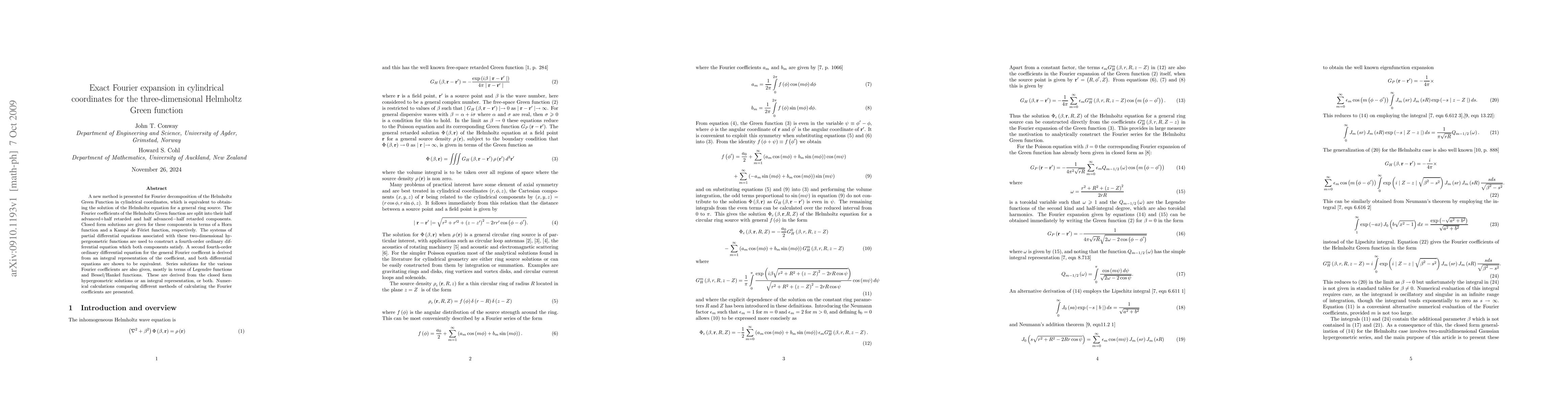 A new method is presented for Fourier decomposition of the Helmholtz Green Function in cylindrical coordinates, which is equivalent to obtaining the solution of the Helmholtz equation for a general ring source. The Fourier coefficients of the Helmholtz Green function are split into their half advanced+half retarded and half advanced-half retarded components. Closed form solutions are given for these components in terms of a Horn function and a Kampe de Feriet function, respectively. The systems of partial differential equations associated with these two-dimensional hypergeometric functions are used to construct a fourth-order ordinary differential equation which both components satisfy. A second fourth-order ordinary differential equation for the general Fourier coefficent is derived from an integral representation of the coefficient, and both differential equations are shown to be equivalent. Series solutions for the various Fourier coefficients are also given, mostly in terms of Legendre functions and Bessel/Hankel functions. These are derived from the closed form hypergeometric solutions or an integral representation, or both. Numerical calculations comparing different methods of calculating the Fourier coefficients are presented.