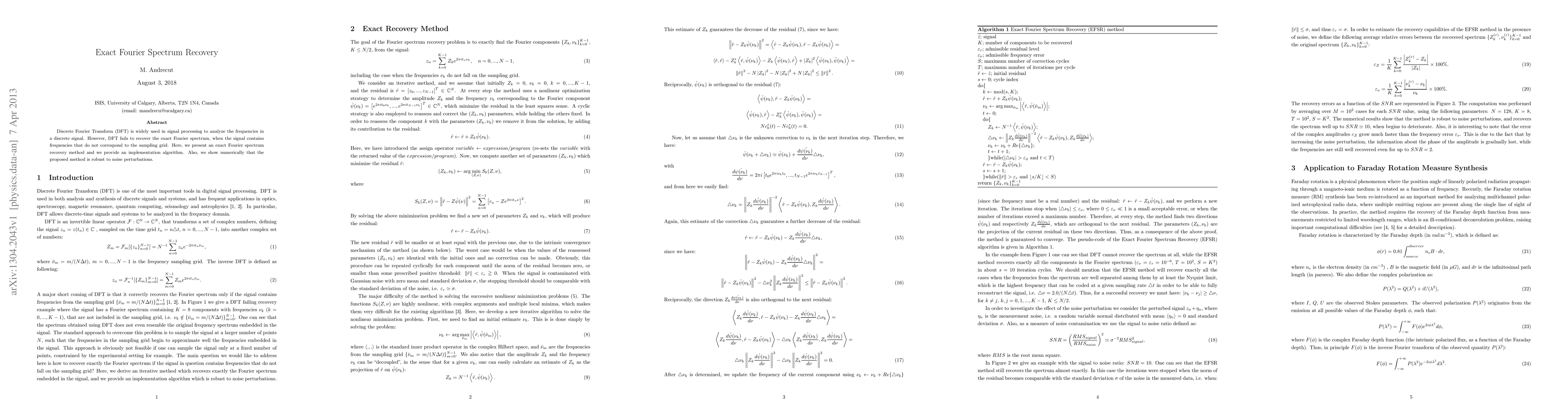 Discrete Fourier Transform (DFT) is widely used in signal processing to analyze the frequencies in a discrete signal. However, DFT fails to recover the exact Fourier spectrum, when the signal contains frequencies that do not correspond to the sampling grid. Here, we present an exact Fourier spectrum recovery method and we provide an implementation algorithm. Also, we show numerically that the proposed method is robust to noise perturbations.