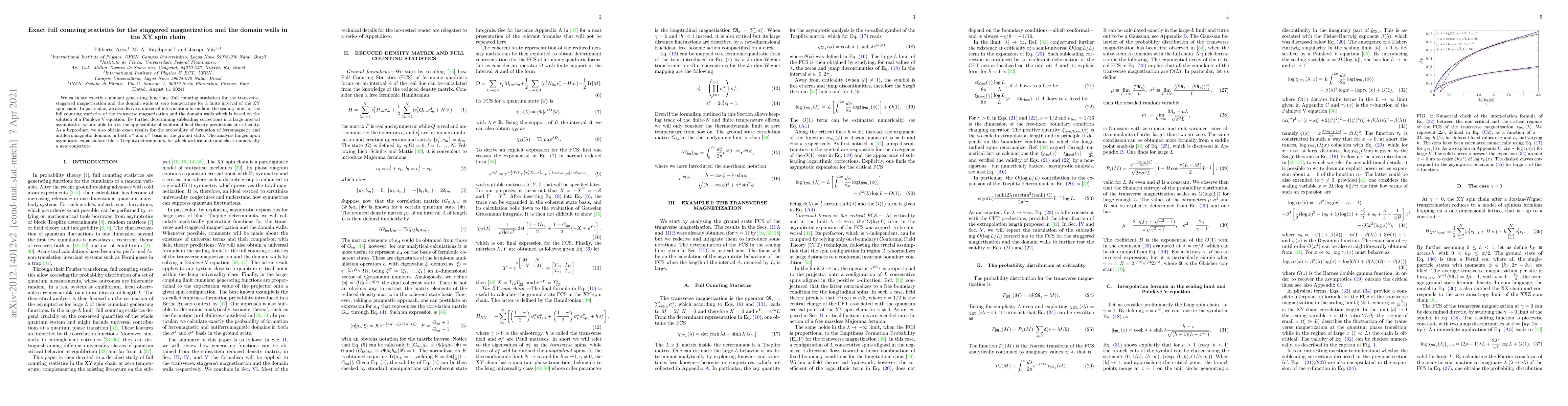 This paper calculates exact full counting statistics for staggered magnetization and domain walls in the XY spin chain, deriving a universal interpolation formula based on a Painlevé V equation and testing conformal field theory predictions. The study also provides exact probabilities for ferromagnetic and antiferromagnetic domain formation.