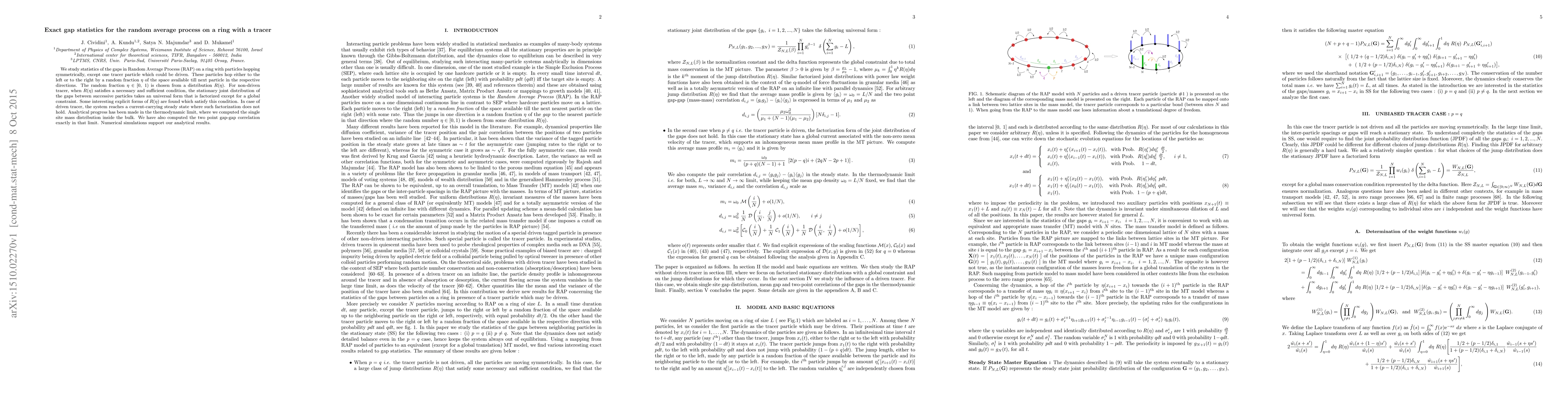 We study statistics of the gaps in Random Average Process (RAP) on a ring with particles hopping symmetrically, except one tracer particle which could be driven. These particles hop either to the left or to the right by a random fraction $\eta$ of the space available till next particle in the respective directions. The random fraction $\eta \in [0,~1)$ is chosen from a distribution $R(\eta)$. For non-driven tracer, when $R(\eta)$ satisfies a necessary and sufficient condition, the stationary joint distribution of the gaps between successive particles takes an universal form that is factorized except for a global constraint. Some interesting explicit forms of $R(\eta)$ are found which satisfy this condition. In case of driven tracer, the system reaches a current-carrying steady state where such factorization does not hold. Analytical progress has been made in the thermodynamic limit, where we computed the single site mass distribution inside the bulk. We have also computed the two point gap-gap correlation exactly in that limit. Numerical simulations support our analytical results.