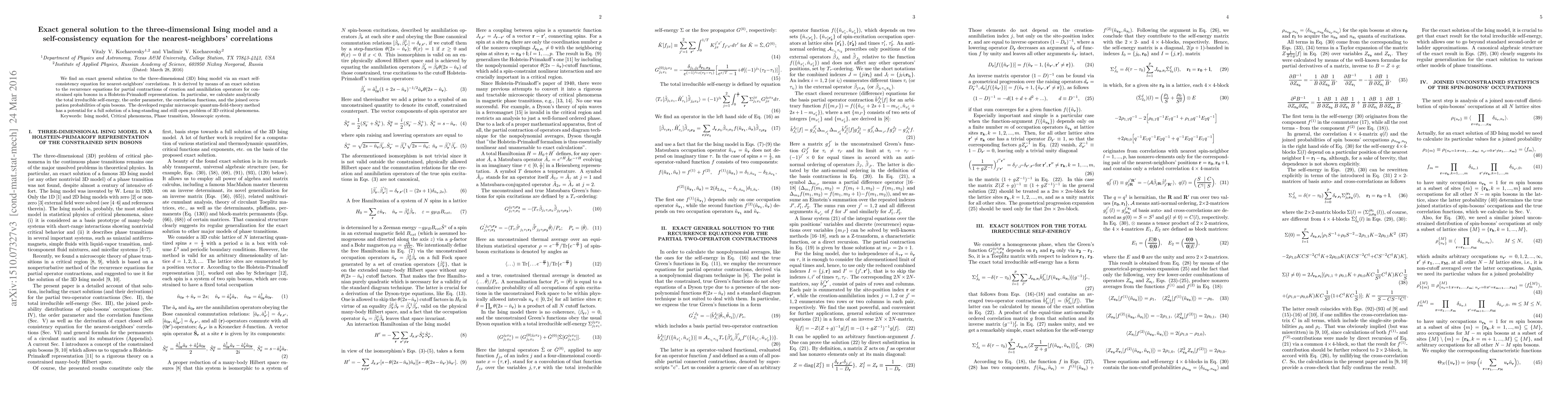 We find an exact general solution to the three-dimensional (3D) Ising model via an exact self-consistency equation for nearest-neighbors' correlations. It is derived by means of an exact solution to the recurrence equations for partial contractions of creation and annihilation operators for constrained spin bosons in a Holstein-Primakoff representation. In particular, we calculate analytically the total irreducible self-energy, the order parameter, the correlation functions, and the joined occupation probabilities of spin bosons. The developed regular microscopic quantum-field-theory method has a potential for a full solution of a long-standing and still open problem of 3D critical phenomena.