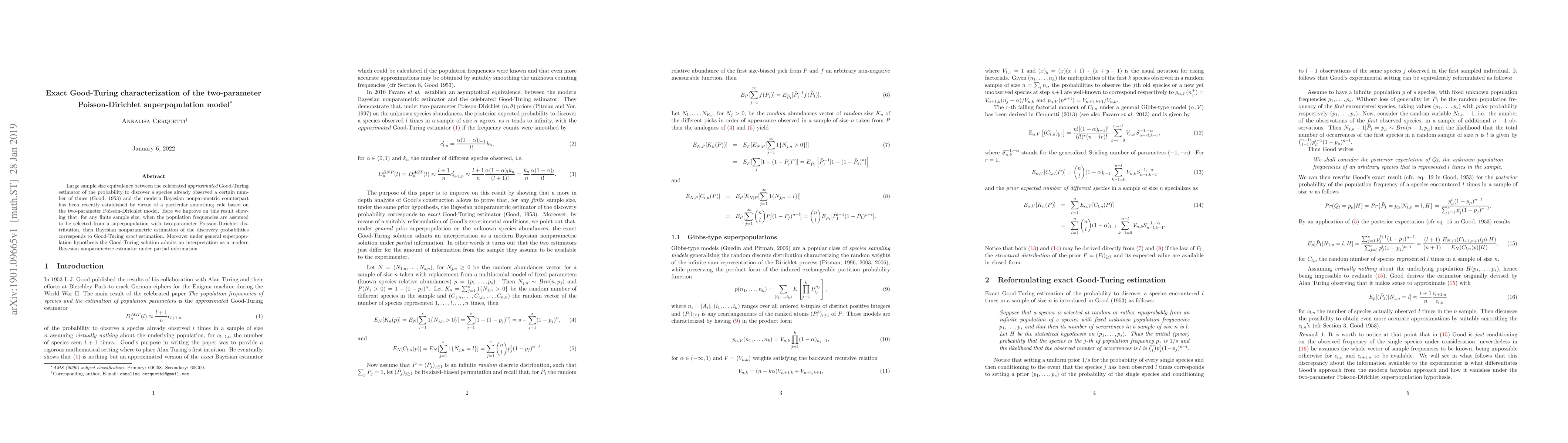 This paper provides an exact characterization of the Good-Turing estimator for species discovery probabilities under the two-parameter Poisson-Dirichlet superpopulation model, showing that Bayesian nonparametric estimation matches the exact Good-Turing method for finite sample sizes. It also interprets the Good-Turing solution as a modern Bayesian estimator under partial information.