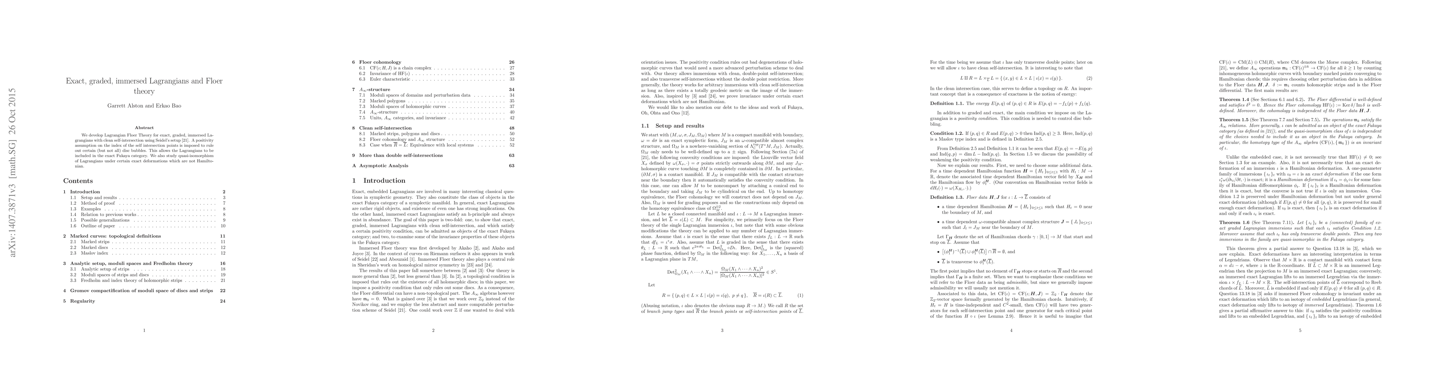 This paper develops Lagrangian Floer Theory for exact, graded, immersed Lagrangians, imposing a positivity condition to manage disc bubbles and enabling inclusion in the exact Fukaya category. It also examines quasi-isomorphisms of Lagrangians under exact deformations that are not Hamiltonian.