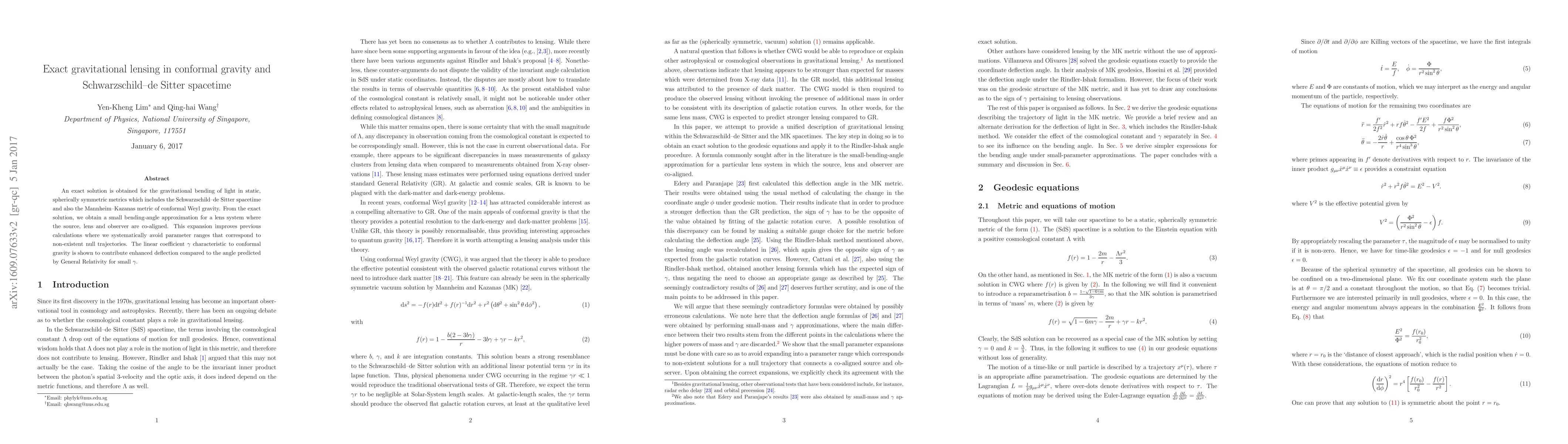 An exact solution is obtained for the gravitational bending of light in static, spherically symmetric metrics which includes the Schwarzschild-de Sitter spacetime and also the Mannheim-Kazanas metric of conformal Weyl gravity. From the exact solution, we obtain a small bending-angle-approximation for a lens system where the source, lens and observer are co-aligned. This expansion improves previous calculations where we systematically avoid parameter ranges that correspond to non-existent null trajectories. The linear coefficient $\gamma$ characteristic to conformal gravity is shown to contribute enhanced deflection compared to the angle predicted by General Relativity for small $\gamma$.