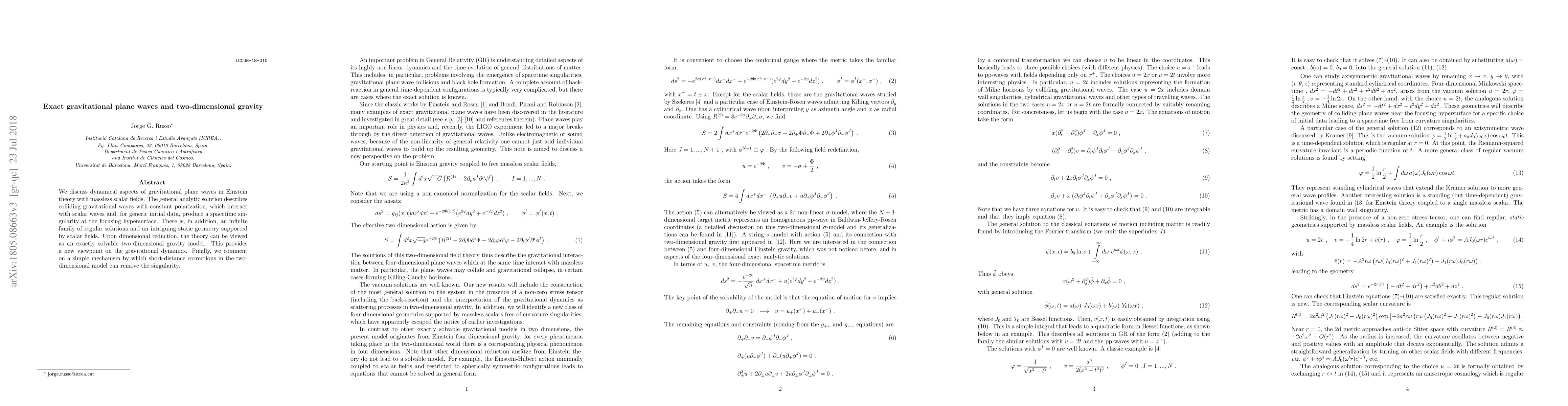 This paper explores gravitational plane waves in Einstein theory with massless scalar fields, detailing their interaction and the formation of spacetime singularities. It also presents a two-dimensional gravity model derived from dimensional reduction, which offers new insights into gravitational dynamics and proposes a mechanism to resolve singularities in the reduced model.