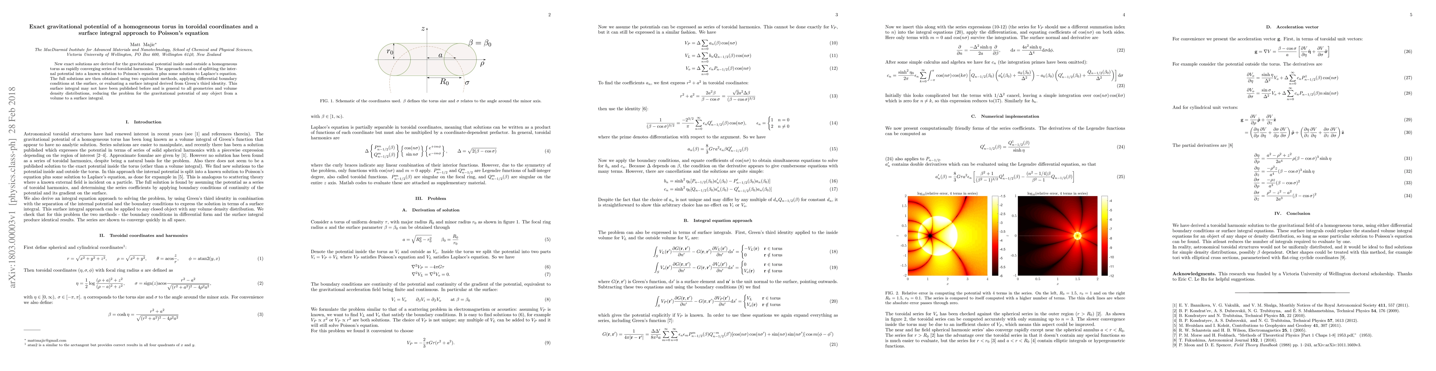 This paper derives exact gravitational potential solutions for a homogeneous torus using toroidal harmonics, employing both differential boundary conditions and a novel surface integral approach based on Green's third identity, which simplifies the problem to a surface integral applicable to various geometries.