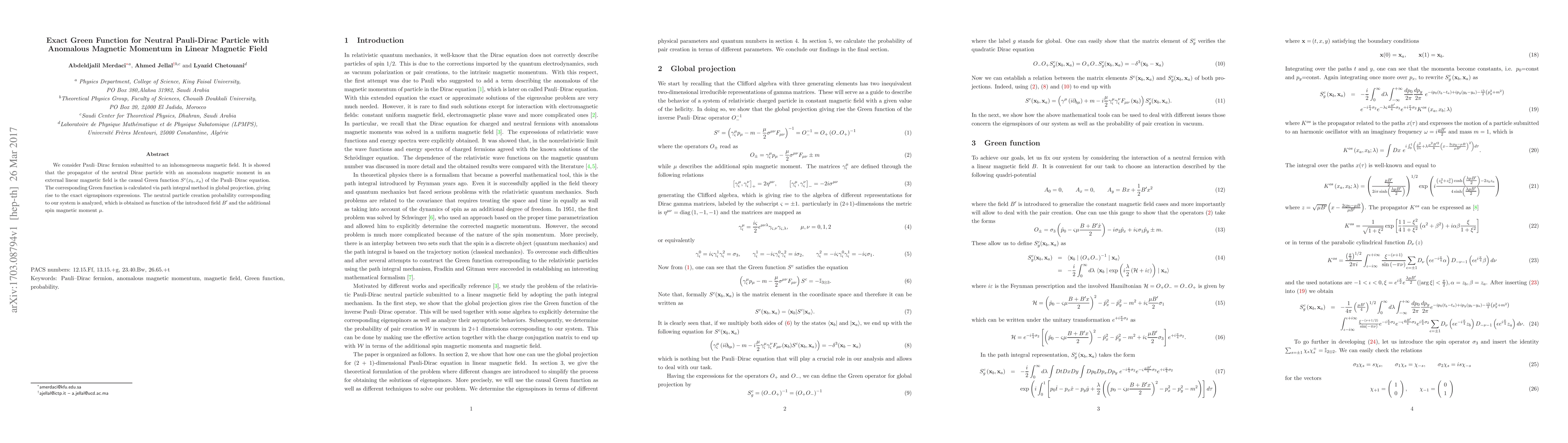 This paper calculates the exact causal Green function for a neutral Pauli-Dirac particle with an anomalous magnetic moment in a linear magnetic field using the path integral method. The study provides exact eigenspinor expressions and analyzes the neutral particle creation probability as a function of the magnetic field and spin magnetic moment.