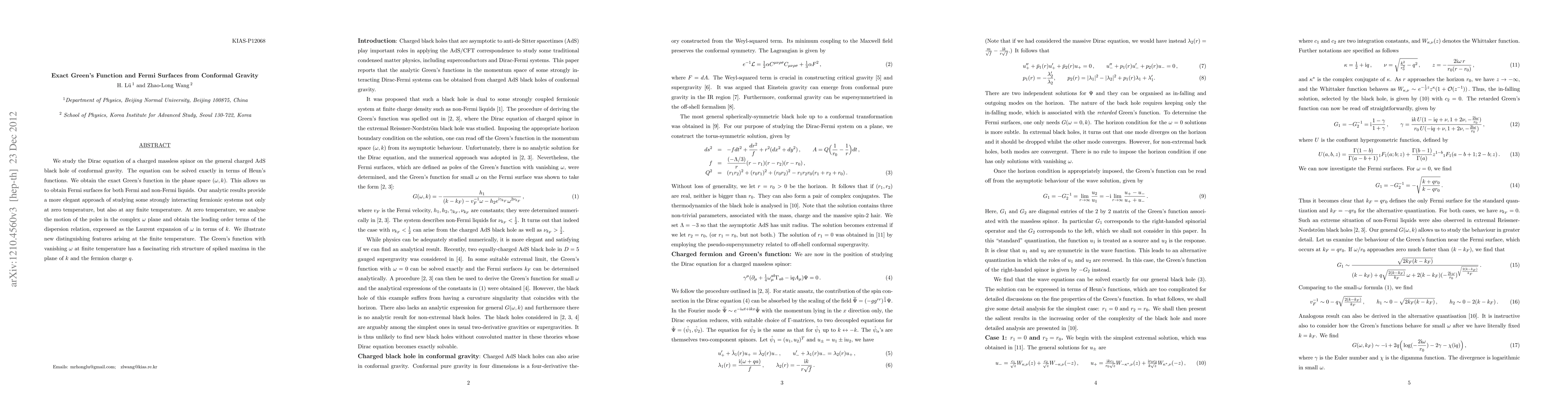 We study the Dirac equation of a charged massless spinor on the general charged AdS black hole of conformal gravity. The equation can be solved exactly in terms of Heun's functions. We obtain the exact Green's function in the phase space (\omega,k). This allows us to obtain Fermi surfaces for both Fermi and non-Fermi liquids. Our analytic results provide a more elegant approach of studying some strongly interacting fermionic systems not only at zero temperature, but also at any finite temperature. At zero temperature, we analyse the motion of the poles in the complex \omega plane and obtain the leading order terms of the dispersion relation, expressed as the Laurent expansion of \omega in terms of k. We illustrate new distinguishing features arising at the finite temperature. The Green's function with vanishing \omega at finite temperature has a fascinating rich structure of spiked maxima in the plane of k and the fermion charge q.
