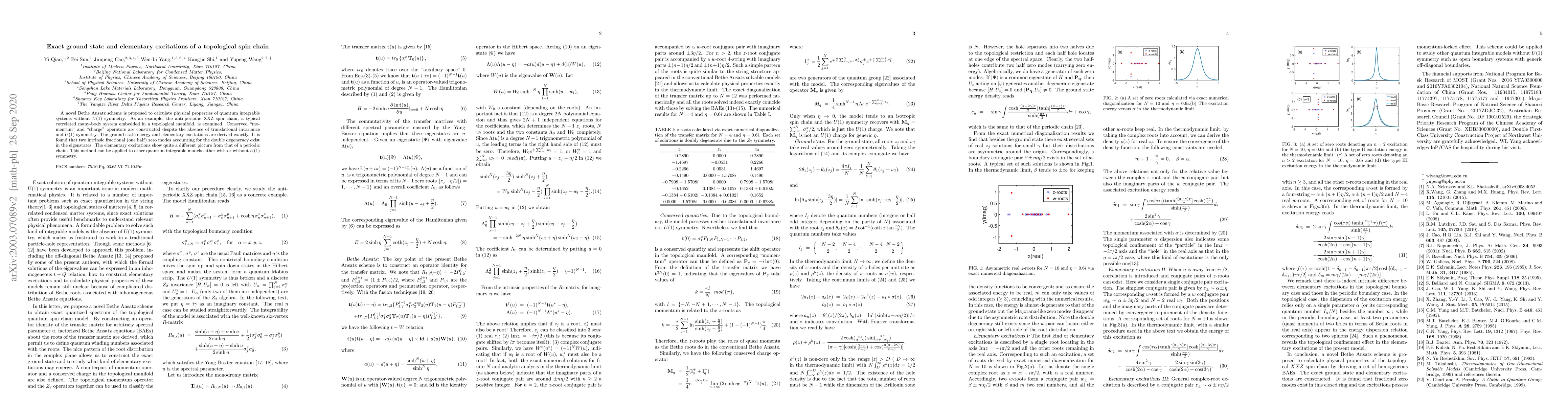 A novel Bethe Ansatz scheme is proposed to calculate physical properties of quantum integrable systems without $U(1)$ symmetry. As an example, the anti-periodic XXZ spin chain, a typical correlated many-body system embedded in a topological manifold, is examined. Conserved "momentum" and "charge" operators are constructed despite the absence of translational invariance and $U(1)$ symmetry. The ground state energy and elementary excitations are derived exactly. It is found that two intrinsic fractional (one half) zero modes accounting for the double degeneracy exist in the eigenstates. The elementary excitations show quite a different picture from that of a periodic chain. This method can be applied to other quantum integrable models either with or without $U(1)$ symmetry.